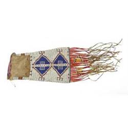 WONDERFUL 19TH C. PLAINS INDIAN PIPE BAG. An absolutely beautiful pipe bag, this item is sewn with a mix of sinew and coarse thread. Size: 26” x 8-1/4”. The upper edge of the bag was decorated with beads, rolled in and stitched to provide a sturdy lip that doesn’t collapse. Both sides of the bag are decorated similarly, with a bold geometric pattern of red, white, and blue beads fully covering about70% of the bag. An area at the top on both sides is left blank, except for a wave design of gold and blue beads. Four inches of the fringe at the bottom of the bag is wrapped with dyed porcupine quills of red, white, blue and gold in a diamond-shaped design. Two narrower, longer 8-9”) pieces of fringe are attached to each of the quill-wrapped fringes. CONDITION: Very good, overall. There are minor losses of beading, some losses of quill-work on the fringe, and some losses of the finer long fringe. In total, though, this pipe bag is wonderfully attractive, and the wear is consistent with careful use. 4-50138 SO26
