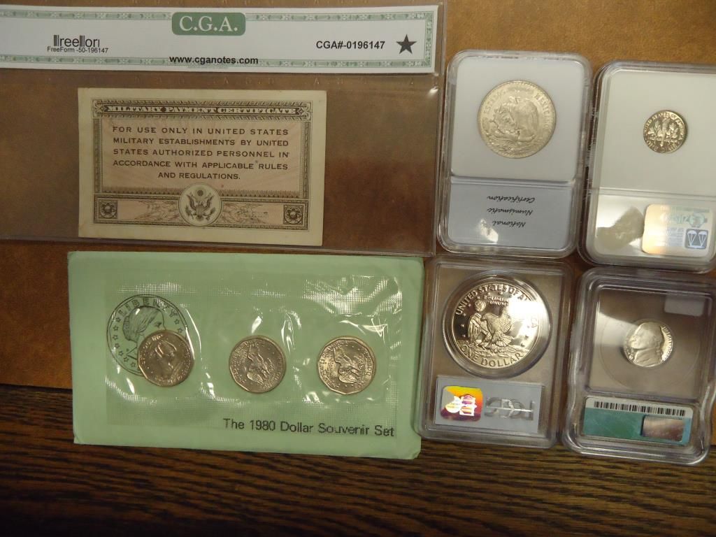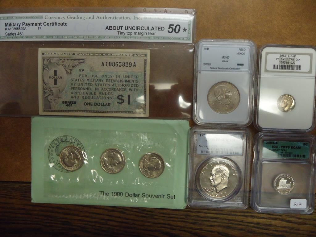 2004-S KEEL BOAT NICKEL ICG PR70 DCAM, 1982-S ROOSEVELT DIME NGC PF69 ULTRA CAMEO, 1977-S IKE DOLLAR PCGS PR68 DCAM, 1948 MEXICO PESO NNC MS63, 1980-P/D/S SBA DOLLAR SOUVENIR SET AND MILITARY PAYMENT CERTIFICATE $1 SERIES 461 CGA ABOUT UNC