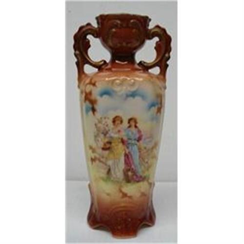 GORGEOUS ANTIQUE FANCY VASE, DECORATED WITH A BEAUTIFUL PICTURE OF A TWO YOUNG LADIES IN A GARDEN SURROUNDINGS, LOVE THE FANCY HANDLES FANCY FEET THAT VASE STANDS ON AND RAISED DECORATIONS,excellent condition,Vase measures 8 1/4" high - THE BOTTOM OF THE VASE READS: MADE IN CZECHOSLOVAKIA, NUMBER 30, US BUYER TO PAY 8.00 FOR SHIPPING PLUS INSURANCE.THANKS.