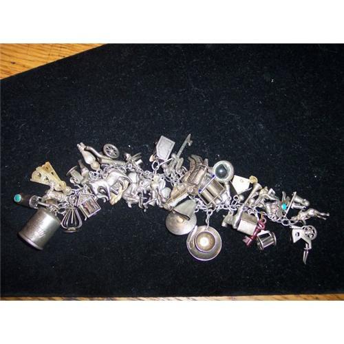 I went to the estate auction of a prominent attorney in our town.Lots of unusual items.I purchased a number of pieces of jewelry. Some of the pieces I do not know alot about and some I am familiar with.This is the most fabulous charm bracelet I have ever had.I counted 52 charms but there could be more.I will list some of the charms-dog by fire hydrant,indian figure with turquoise stone,binoculars,rickshaw,lawn mower-push type,horse shoe,cuckoo clock,seal w/ball,heart,wringer washer,magnifying glass(this does have a crack in the glass),plate bowl and spoon all together,sombrero,bell,hatchet,ladder,car,cowboy boots,tricycle,roller skate,whistle,slot machine,oranges w/leaves,jestor,meat grinder,bowler,heart,cross,anchor,chaps,donkey,cannon,palm trees,arrowhead,scissors,indian chief,man playing guitar,man & lady in house,dog,gun,fan,cowboy boot with spurs,bird cage?,covered wagon,round canister that opens and on the outside of it says-My Identity.There are a few more that I am not sure what they are.Some are mechanical.The covered wagon also has a piece of turquoise on its top.Some are marked sterling,some I can not tell.There are only two with damage.The magnifying glass is cracked in the glass and one heart is not in good shape.The rest all look fine.Very hard to find these vintage charm bracelets with this many charms.The chain is also sterling but you cannot see much of it due to the amount of charms on it.