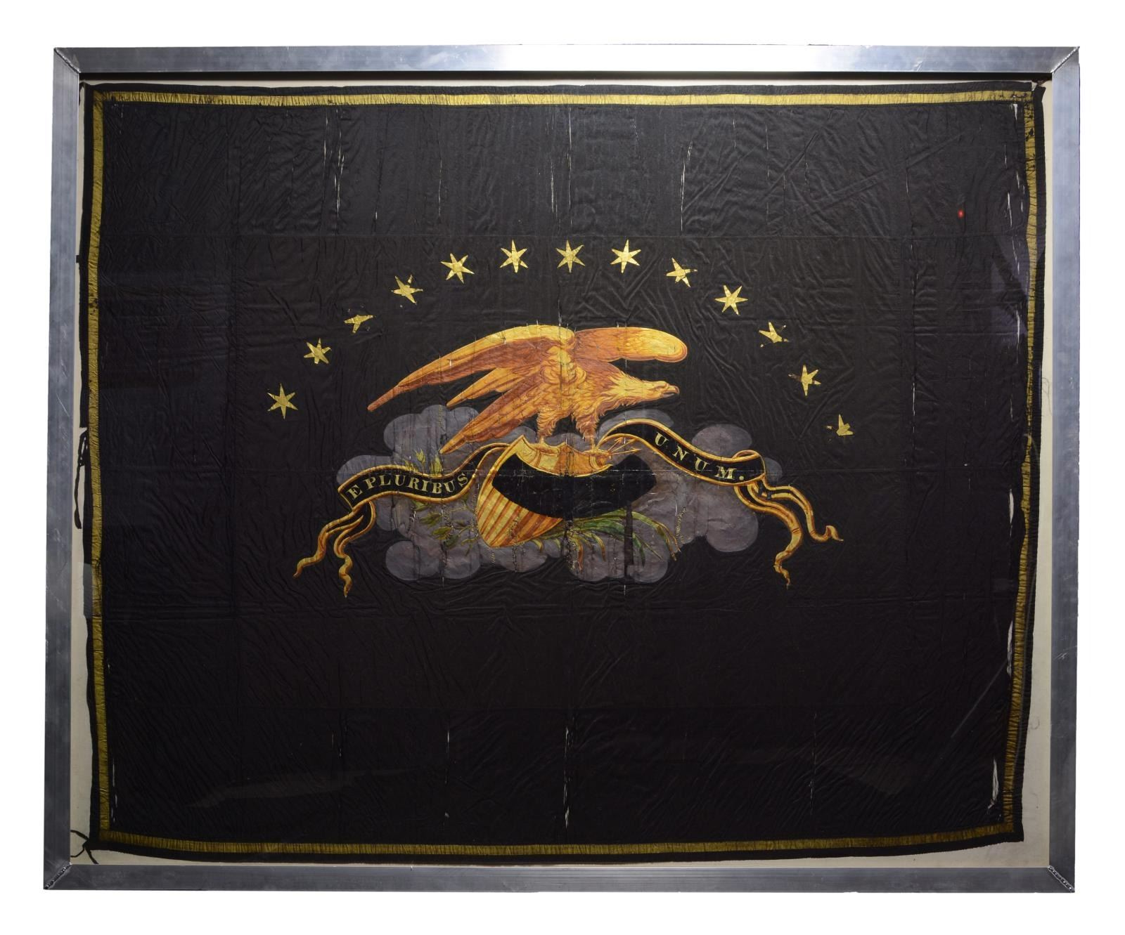 OFFICER'S MOURNING FLAG. This 2-sided flag measures approximately 73 1/2" x 59 1/2", and it is housed in an aluminum frame that measures 78 1/4" x 64 1/2". The body of the flag is black silk with 5 ties (1 missing) down the hoist side. The central figure is an eagle on top of a United States shield. The eagle grasps 3 arrows in its left talon. The eagle and shield are superimposed over a cloud, as was a common depiction in the early years of this country. There is a gold edged black ribbon on either side of the eagle with gold lettering that reads, "E PLURIBUS UNUM.". The shield is partially covered in black emulating draped crepe. Behind the lower section of the shield is an olive branch and a palm branch representing peace and victory. Above the eagle are 13 stars with 6 points that appear to be gold leaf on the black silk. The entire black flag has a 1" gold border that also appears to be gold leaf. There has been much conjecture about the age of use of this flag. There seems to be little doubt, because of the color, the black ribbon, and the black crepe, that it is a mourning flag. Noted Westpoint curator, Les Jensen, after examining the flag, stated it was definitely a US Regulation flag and not one made for a state Militia. Therefore, it would only be used, officially, for a US President or high-ranking military officer. The overall 8-piece construction of the flag is indicative of the late 18th century. Most pigments in the paint existed in the 18th century; however, lead chromate, the yellow pigment, was not commercially available until early 19th century. However, the pigment was discovered and occasionally used in the late 18th century. A detailed analysis, by the firm Scientific Analysis of Fine Art, placed the flag in the war of 1812 era with possible dating as early as 1810 or as late as 1840. Given the above facts, it is possible to draw the conclusion that this flag could have been used in one of the funeral precessions for President George Washington. It is also possible the flag could have been used in one of the funeral precessions in 1826 for President Thomas Jefferson and President John Adams, who died on the same day. Lastly, it is also possible that the flag led one of the funeral precessions for one of the many heroes of the war of 1812. Very few United States flags from this period, or with such historic importance, exist today. The flag is accompanied by a 28 3/4" x 40 1/2" framed photograph of the back side of the flag. UNATTACHED ACCESSORIES: several photocopies of information about the flag and related material. CONDITION: the flag is archivally framed. The silk has several separations, but the flag is nearly complete and displays exceptionally well. The painted colors are strong and vivid and show little degradation, given the age of the flag. There is some peeling to the gold stars, but most are nearly 100%. (02-21040/BF). $40,000-60,000.