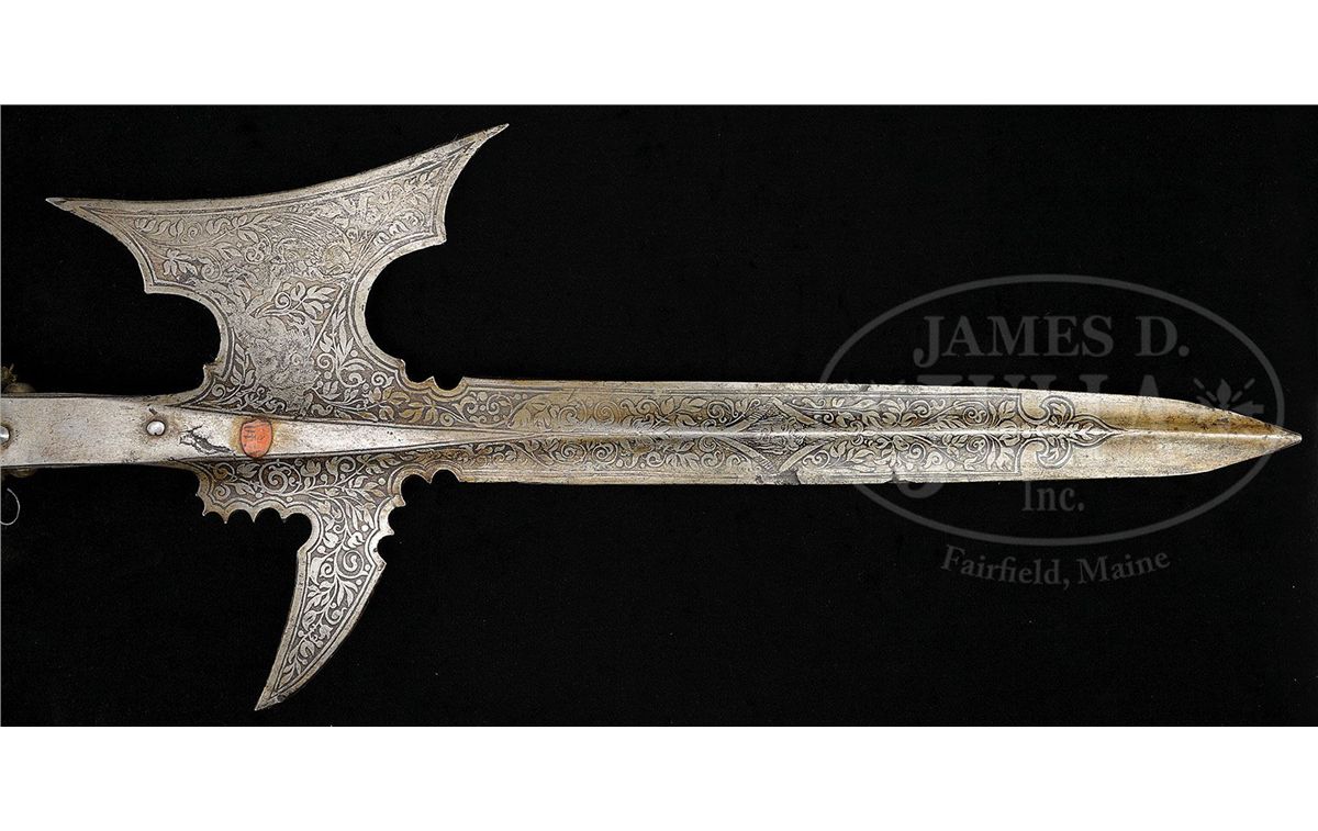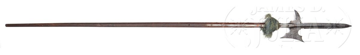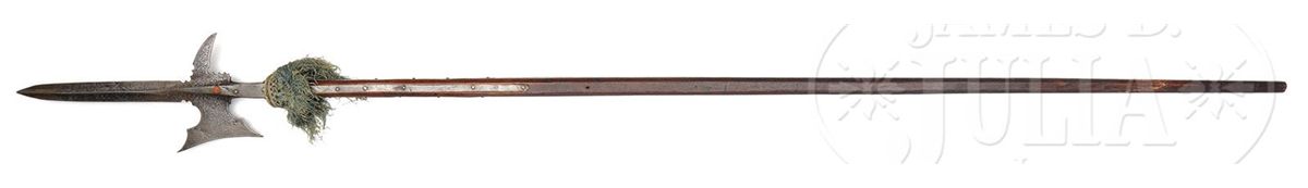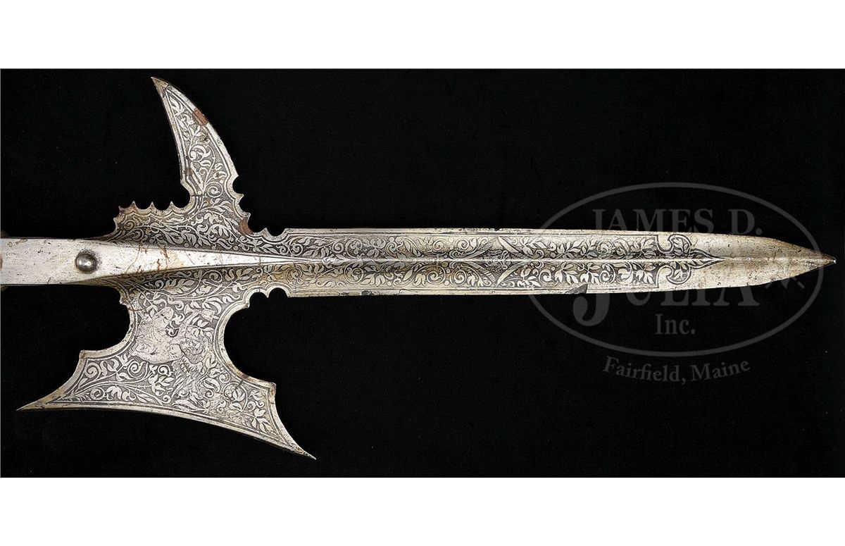 NSN. Halberd is boldly etched with angels, masks and scrolling foliage all on a blackened ground in the Saxon manner. Metal shows delamination and proper age. This is a properly forged piece and not a casting. CONDITION: Fine, etching retaining most of its definition and considerable original blackened ground. Delamination and forging flaws are exactly what one likes to see in these pieces. Straps are original, intact and uncut. Pole is quite possibly the original pole.Etched pole arms of this type are highly desirable and this example is such an item. 4- 49154-2 MRZ75