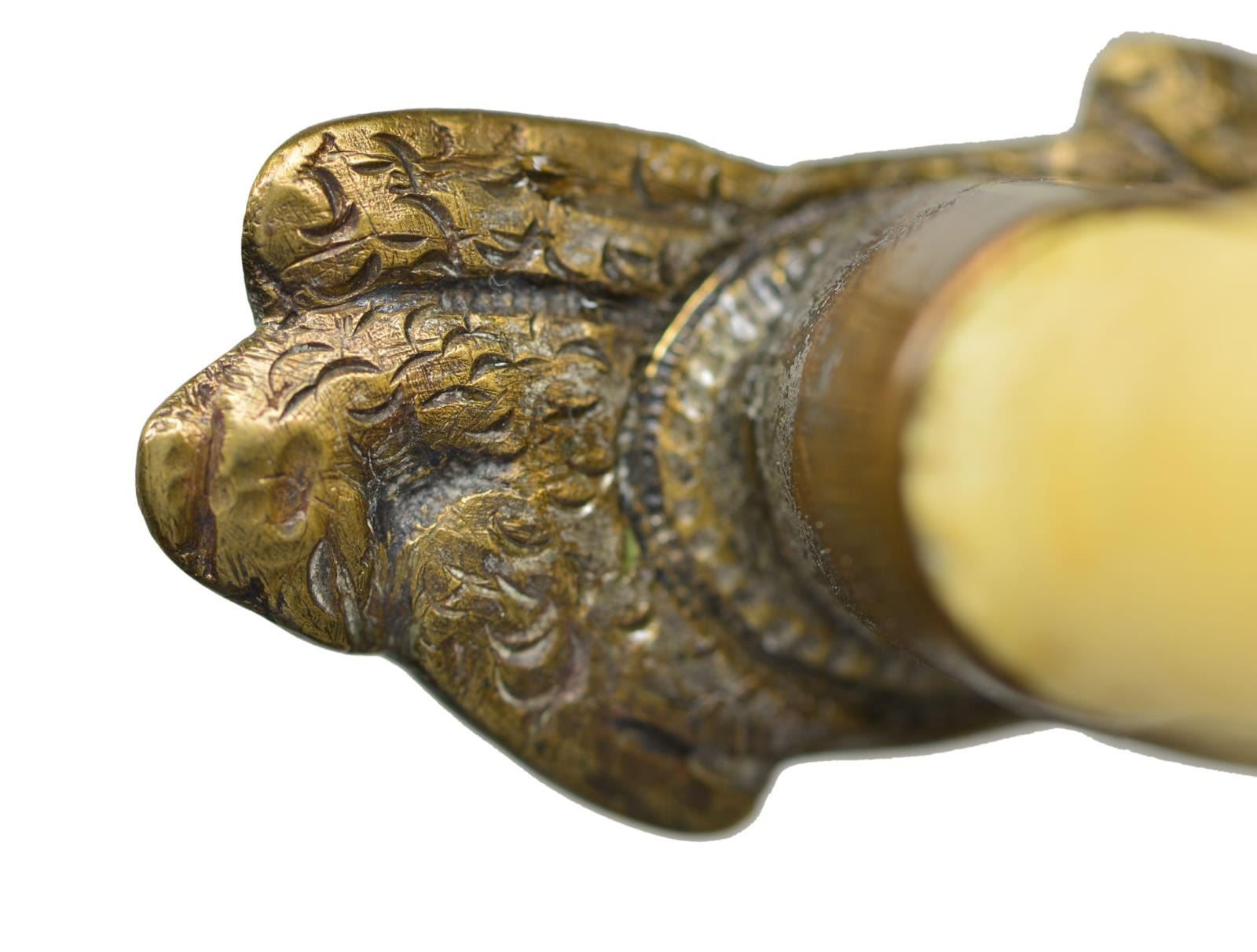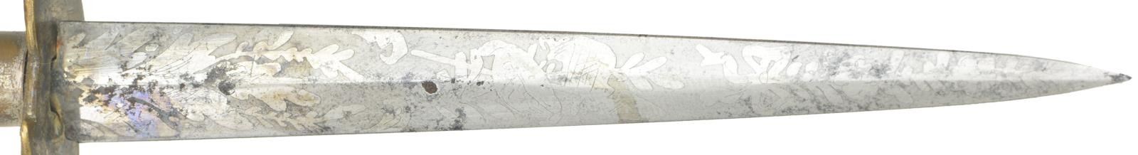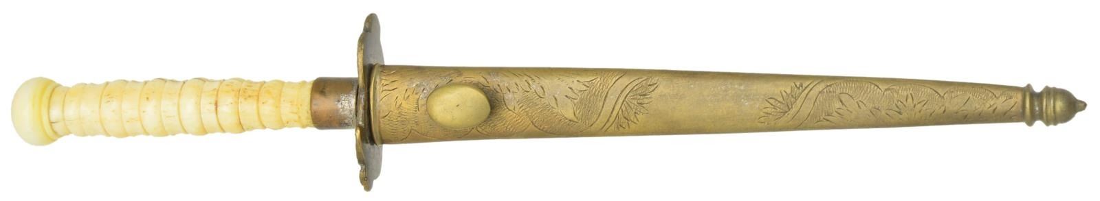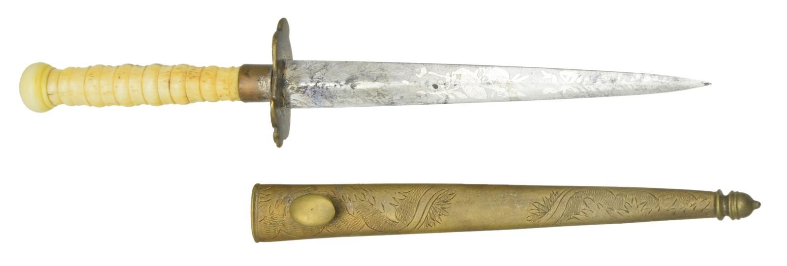 Overall length: 9 1/4". Blade length: 5". Blade has a raised medial ridge and is etched over its entire length with a Liberty cap on pole with flag and drum, a large spread winged American eagle with 15 stars above and various foliate motifs. Silvered brass crossguard in the form of 2 opposing folded wing American eagles. Turned, certifiably antique ivory grip and pommel cap. Plain, silvered brass ferrule. Foliate engraved, silvered brass sheath with oval frog stud. CONDITION: blade has a light gray finish and etching is quite impressive. The eagle crossguard and ferrule have small areas of original silvered finish remaining. Grip shows a few expected age cracks. Sheath has clear and crisp engraving with traces of original silvered finish. (02-17480/BF). $1,600-2,200.