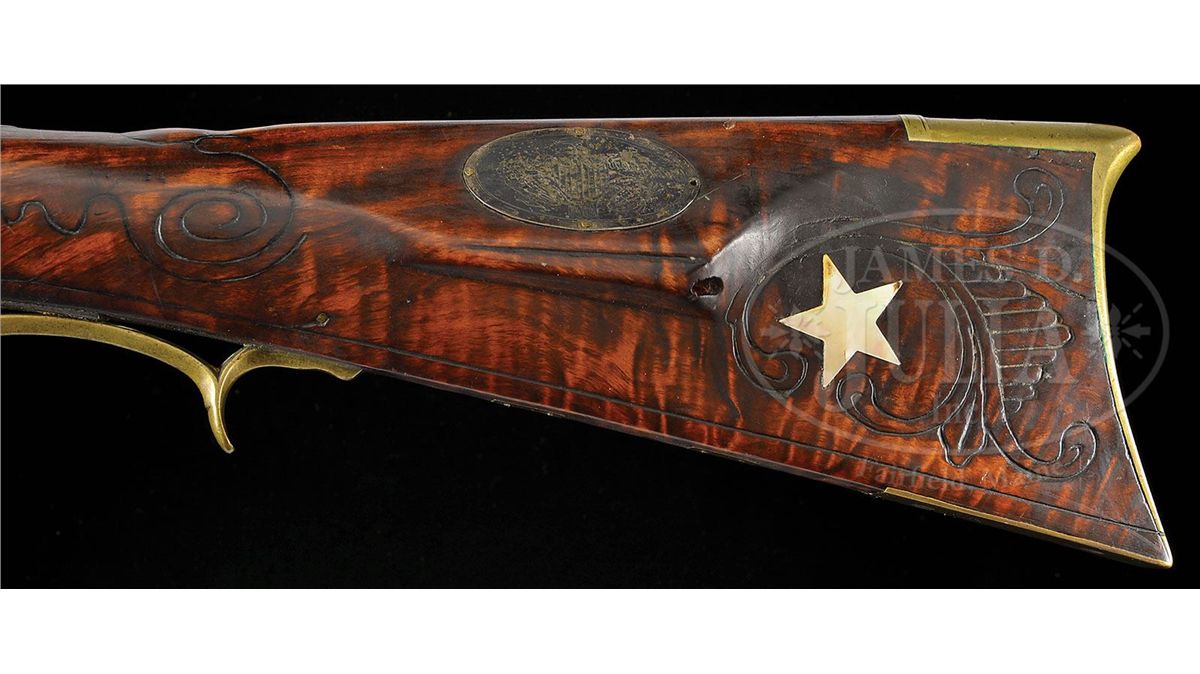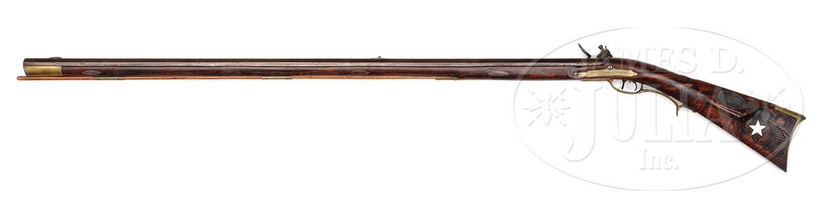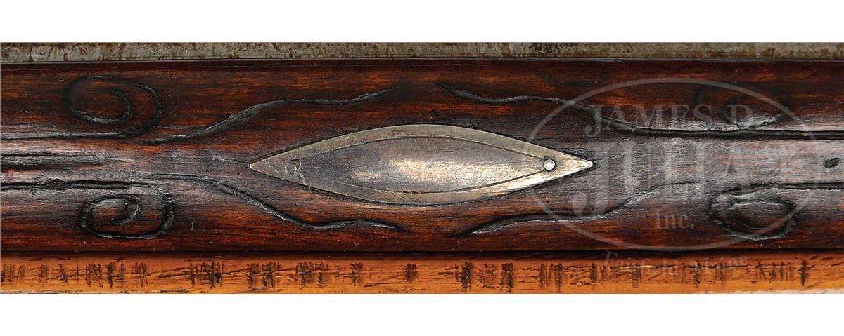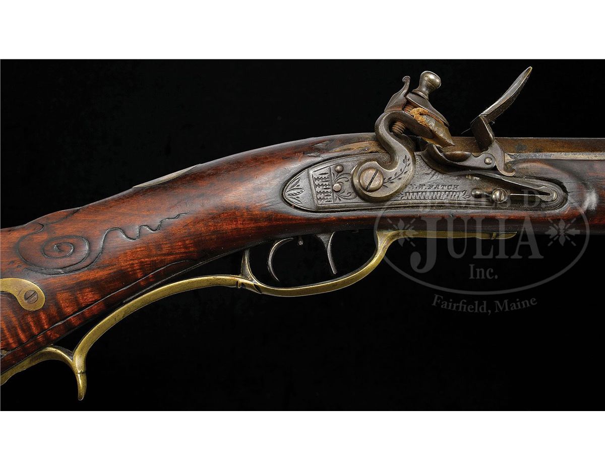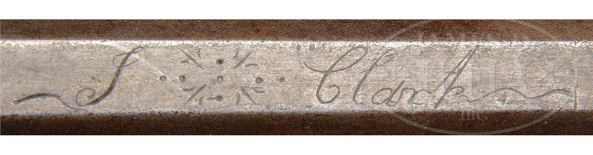 NSN. 42-1/2" full oct .48 Cal rifled bbl signed "J. Clark". This rifle has a characteristic Bedford style 4-pc engraved brass patchbox with 5 piercings and a "Q" finial. Curly maple stock is incised carved with "C" scroll to rear of cheekpiece with circular incised carving forward of cheekpiece and patchbox. There is attractive incised carving running full length of forestock on both sides with an attractive pattern around each of the silver forestock inlays. There is a large silver oval inlay on cheek engraved with American eagle and there is a 5-pointed bone star inlay surrounded by butt carving behind cheekpeice. Oval silver inlay on wrist behind bbl tang. Flintlock is marked "N.W. PATCH". James Clark was born in Lancaster County and served as an artillery artificer during the revolution period. He was briefly a captive of the English. He then worked at the Carlisle barracks 1798-1813. He worked as a gunsmith in Bedford and died in July of 1841 in Blair County. CONDITION: Generally very good. There is some wood filler above the rear ramrod pipe. Lock needs some adjustment. Stock has been cleaned. 4-49134 RG109