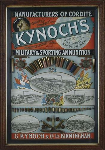 WONDERFUL KYNOCH CARTRIDGE BOARD. Fabulous colorful board in its orig deep shadow box picture frame, 37-1/2" high x 26-1/8" wide, outside dimensions, with oak outer frame & gold gesso inner frame with a black sub-frame. It has 9 rifle cartridges, 14 shot shells, 29 hand gun cartridges, including centerfire, pinfire, rimfire shot shells & rimfire blanks. There are also five percussion cap tins & two railway alarm signals. They are all mounted on a very colorful board, primarily red & green with all the maker's company information & address with their lion trademark, their crest & five vignettes of their factories. It has the orig heavy backing paper with two over labels, one from the framing company of Birminham and the other from the Kynoch Company which states that it is the property of the company and that they would be glad to replace it at any time and further asks that it be returned when finished". CONDITION: Extremely fine. Cartridges are all bright & clean with some light fading to some of the paper shot shells. Mounting board is bright & colorful with clean crisp colors & sharp images. Altogether a very rare & desirable board. 4-57008 JR722 (4,000-7,000)"