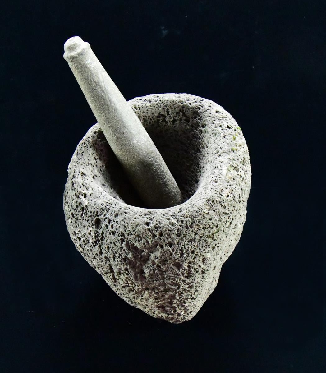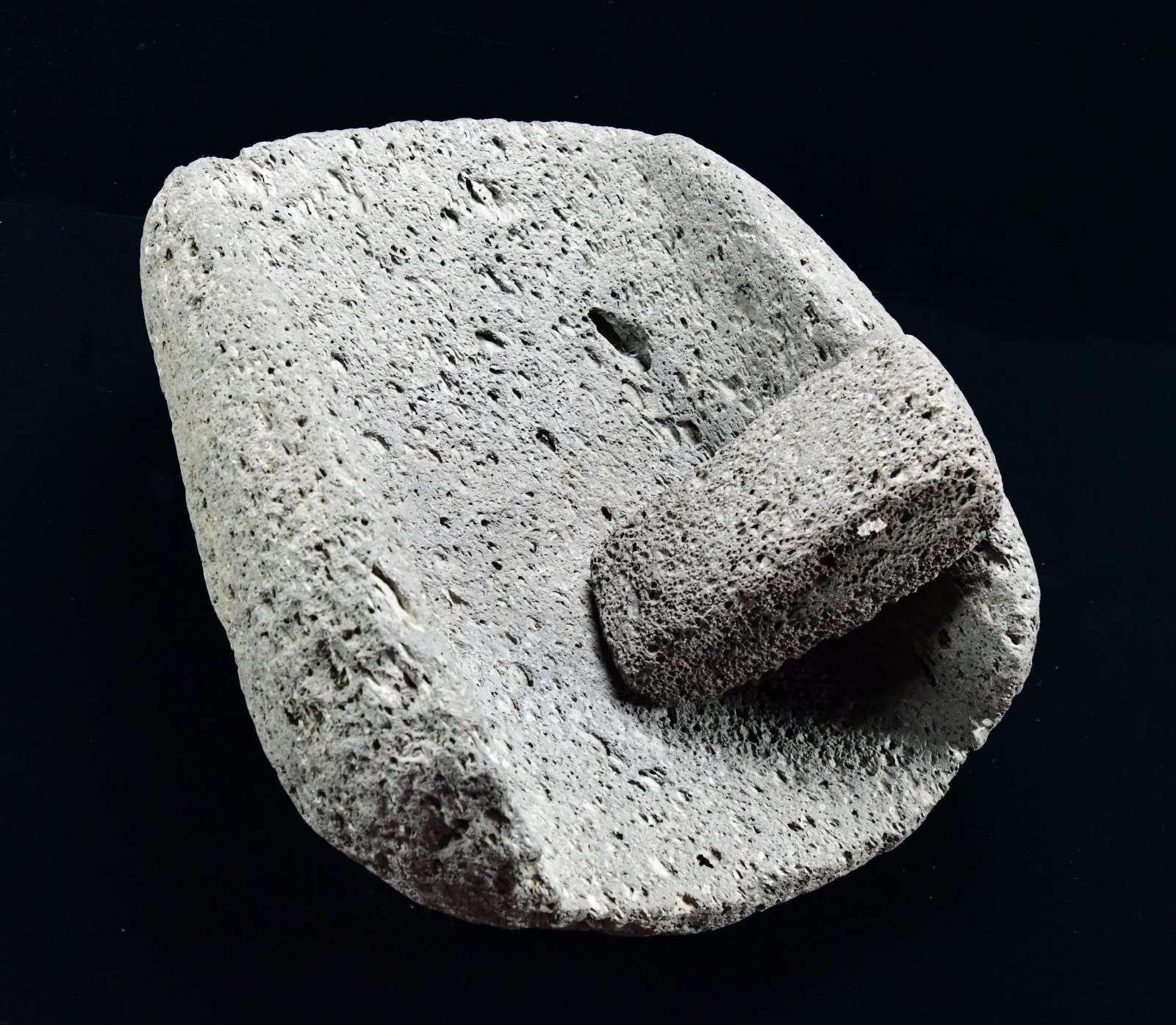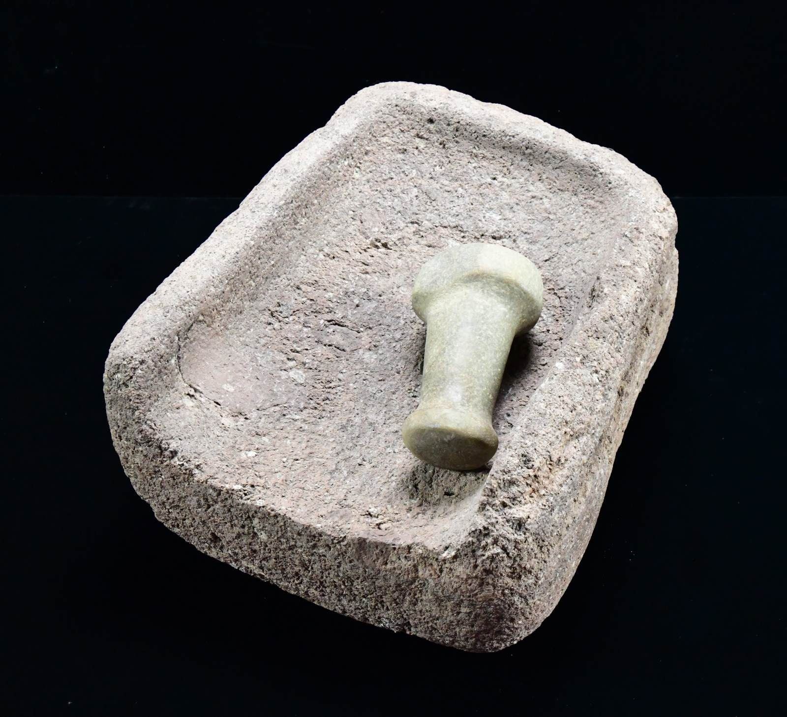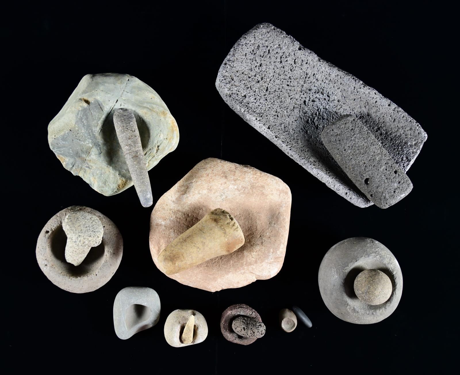 GRINDING STONES. Grinding stones, both metates (mortars) and mano (pestles) & stone rollers are found throughout Native American societies and were major part of agrarian life. Glen Mattox had his collection beautifully displayed on one wall of his museum store mixed in with other artifacts. Many of the pestle grinding stones & rollers are finely tapered with cut rings. The largest mortar is 16" x 15", 6" deep with incised line cut around perimeter closed on 3 sides sloped & so flour easily taken out, this stone weighs almost 50 pounds. Here is your chance to buy a lifelong of collecting of over 50 stone utensils used for hundreds of years in Native American society. CONDITION: very good overall, several of the rollers were excavated in 2 pieces and now glued back together. PROVENANCE: from the Lifelong Collection of Glen E. Mattox. (02-18919-1/JS). $500-1,000.