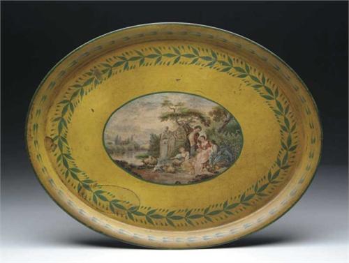 WONDERFUL OVAL SCENIC TOLEWARE TRAY. Tray has a center oval scene showing people and livestock next to water with house and marble statue. Surrounded by mustard ground decorated with green leaf-like borders. SIZE: 19-1/2” x 25-1/4”. CONDITION: Generally good, some stains and craquelure. 9-27937