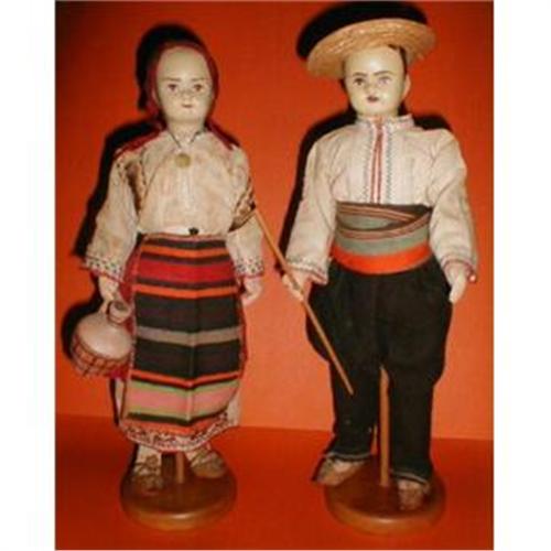 Being offered are a WONDERFUL pair of antique 17" ethnic, possibly Russian(I've been told also possibly Bulgarian, composition/ceramic shoulder head dolls that are dressed in original, authentic, hand-detailed, peasant costumes. These dolls are circa early 1900's and have jointed cloth bodies, individually sewn fingers and composition/ceramic heads with hand painted features. The costumes are of natural fabrics with many hand embroidered details. Both wear GREAT hand made leather sandals. He wears a brimmed straw hat and carries a wooden staff....she wears a silk bonnet and holds a decorated ewer. Around her neck is a beaded necklace with a medallion that has inscriptions that may hold the key to their country of origin.....there are several symbols on each side of this medallion and on one side a word that is spelled as follows; "M E C N(backwards) H L(inverted)".....this may be a word spelled in the Cyrilic alphabet. They are both on sturdy wooden stands and in very good overall condition with minimal scuffing and staining attributed to age. THIS IS TRULY AN EXCEPTIONAL PAIR OF DOLLS!!