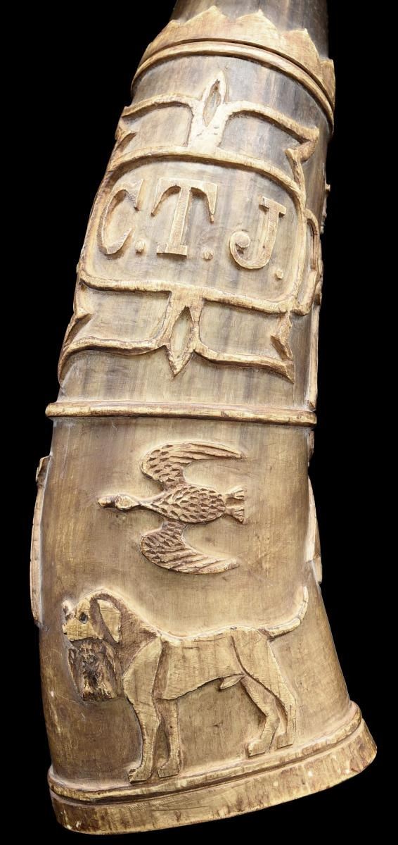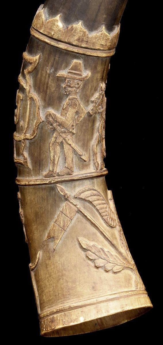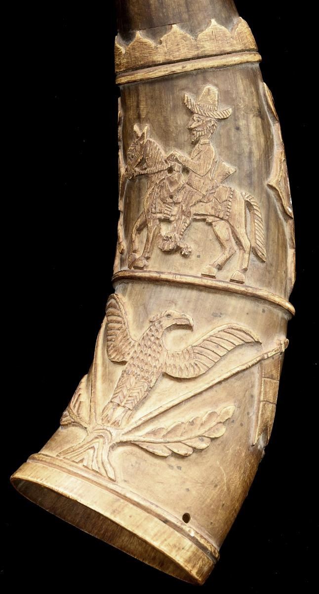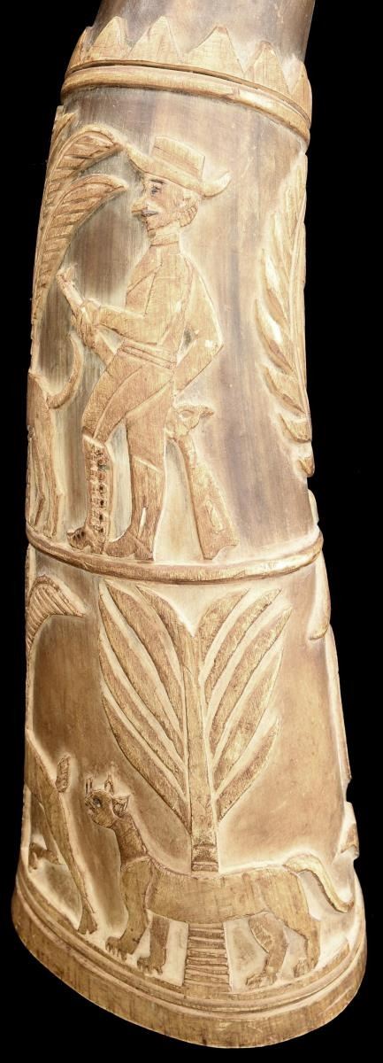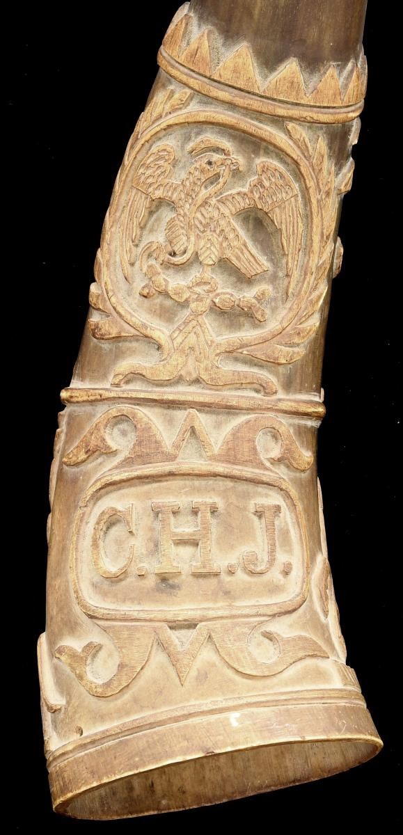 1) This horn measures approx. 11 1/2" in length. It has a turned concave mouthpiece with an open butt. The deep engraving includes a man carrying a rifle & hunting w/ a dog. Beside this visage is an early rendition of the Mexican national seal featuring an eagle w/ snake on cactus. Below this level is a large, fanciful cartouche w/ the initials “C.H.J.”. Opposite the cartouche is a running deer & jaguar in a palm forest. 2) This horn measures approx. 12" in length. It has a turned concave mouthpiece w/ an open butt. The deep engraving includes a man on horseback w/ another gentleman carrying a sword. Also in the upper section is a fanciful cartouche w/ the initials “C.T.J.”. The lower section shows a large spread-wing eagle flanked by Mexican flags. Opposite this is a dog w/ a duck in its mouth and a duck flying above the dog. Given the initials on this fine pair of calling horns, they probably belonged to brothers or a father & son pair. Horns like this were used to call dogs during the hunt. They were also used as an audible locator for hunters that became lost during extended hunts. CONDITION: both horns have a wonderful early patina & show expected wear. Neither horn shows any offensive damage and they both present an impressive visual impact. (02-21141/BF). $500-1,000.