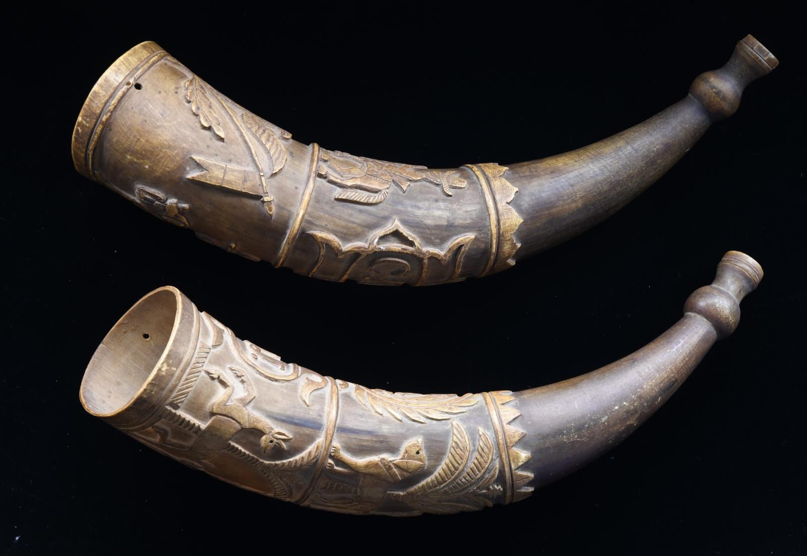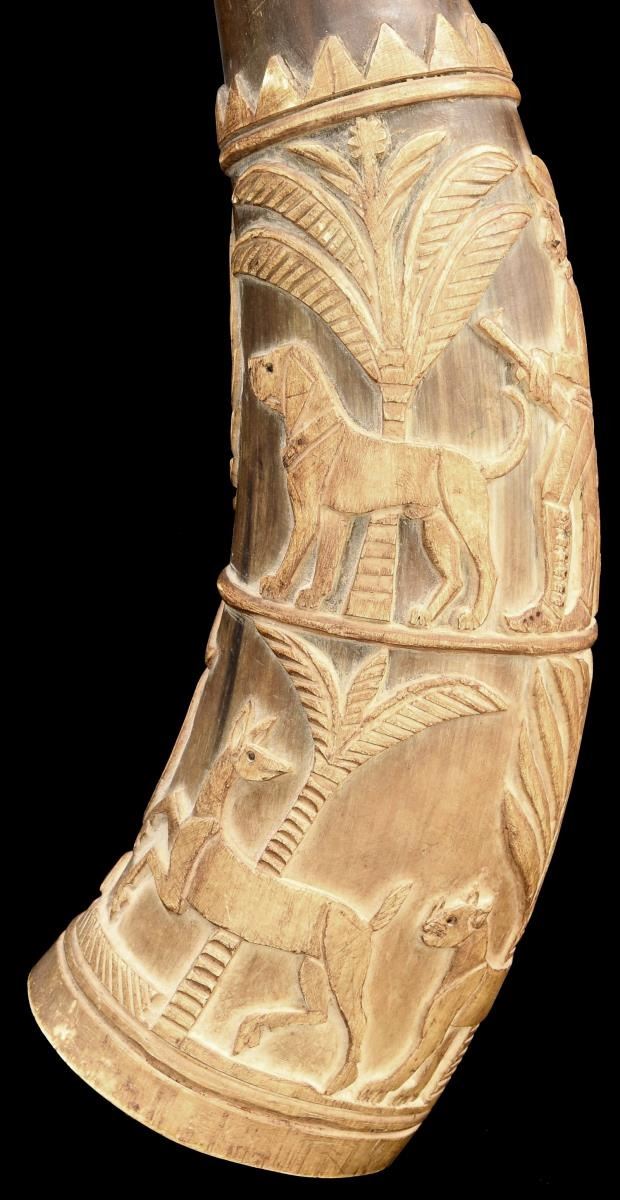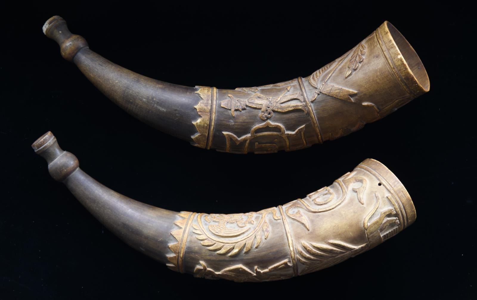 1) This horn measures approx. 11 1/2" in length. It has a turned concave mouthpiece with an open butt. The deep engraving includes a man carrying a rifle & hunting w/ a dog. Beside this visage is an early rendition of the Mexican national seal featuring an eagle w/ snake on cactus. Below this level is a large, fanciful cartouche w/ the initials “C.H.J.”. Opposite the cartouche is a running deer & jaguar in a palm forest. 2) This horn measures approx. 12" in length. It has a turned concave mouthpiece w/ an open butt. The deep engraving includes a man on horseback w/ another gentleman carrying a sword. Also in the upper section is a fanciful cartouche w/ the initials “C.T.J.”. The lower section shows a large spread-wing eagle flanked by Mexican flags. Opposite this is a dog w/ a duck in its mouth and a duck flying above the dog. Given the initials on this fine pair of calling horns, they probably belonged to brothers or a father & son pair. Horns like this were used to call dogs during the hunt. They were also used as an audible locator for hunters that became lost during extended hunts. CONDITION: both horns have a wonderful early patina & show expected wear. Neither horn shows any offensive damage and they both present an impressive visual impact. (02-21141/BF). $500-1,000.