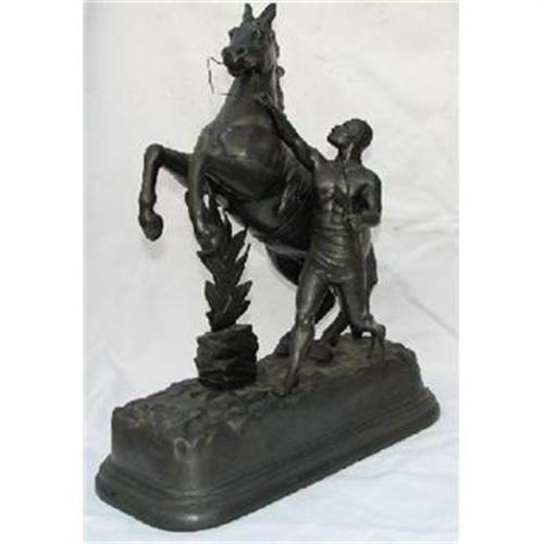 A Great sculpture featuring an African man running with a horse. Appears to be bronzed pot metal; very good condition, but small hole in base on front (see image 4);