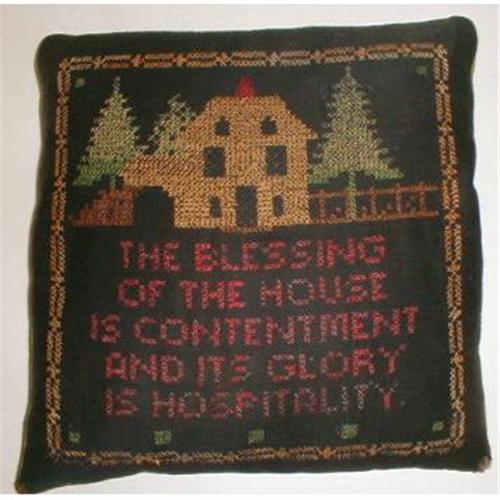 This very nice SAMPLER was done in the late 19th century on black polished cotton with I believe, silk thread and then made into a 16" square pillow which feels as though it is padded with down. The house is done in shades of tan and brown with a red chimney. Trees in shades of green and a brown fence beside the house. The motto in red, "THE BLESSING OF THE HOUSE IS CONTENTMENT AND ITS GLORY IS HOSPITALITY". Double border is gold and there is a green chain stitching around the entire edge of the pillow....all very nicely done. The 2 lower corners have worn though the black and some of the sampler stitching has worn away in certain areas, but overall considering age and its intended use, I would say the condition is very good.