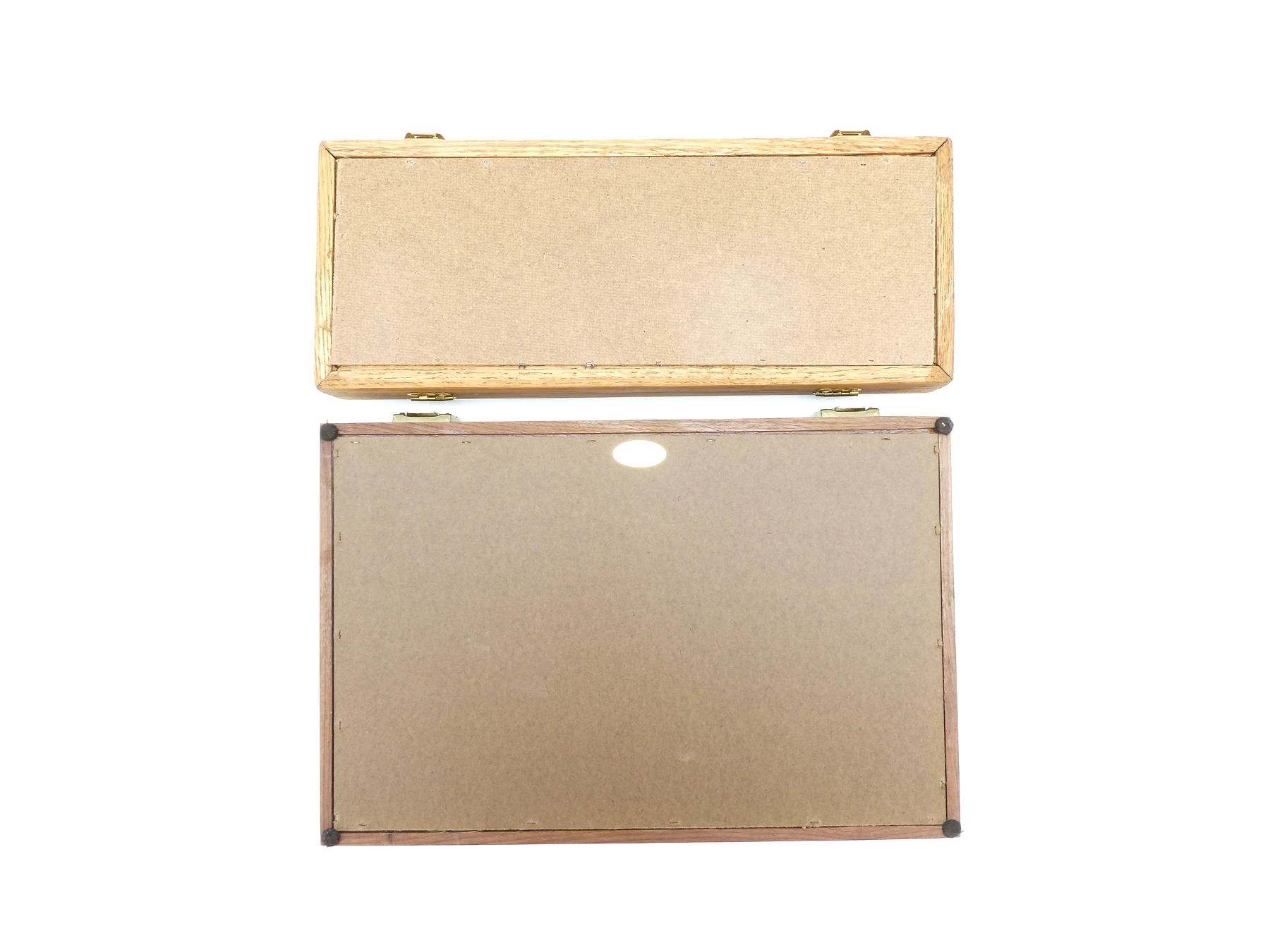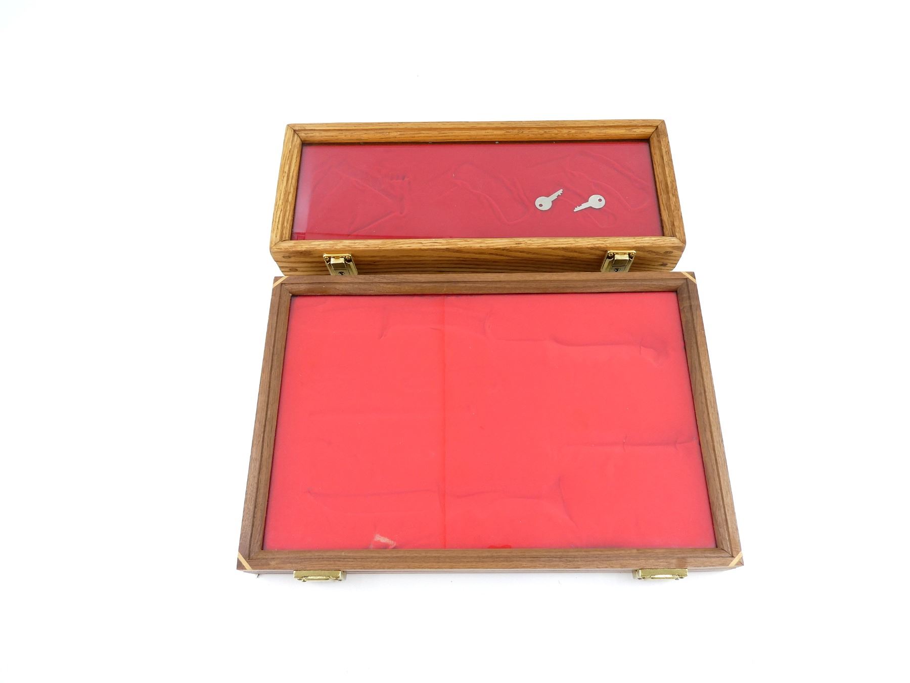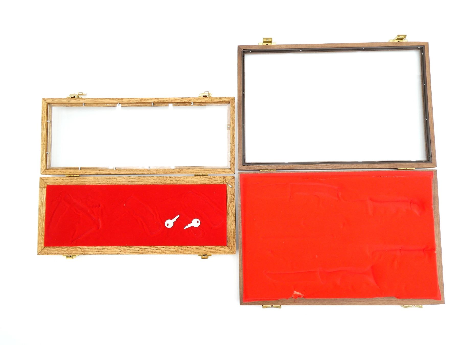 LOT INCLUDES; (1) GLASS DISPLAY CASE, WOOD / GLASS CONSTRUCTION, LATCH CLOSURE, RED FELT LINED / PADDED INTERIOR, LOCKABLE, MISSING KEY, APPROX. 18" X 12" X 2" & (1) GLASS DISPLAY CASE, WOOD / GLASS CONSTRUCTION, LATCH CLOSURE, RED FELT LINED / PADDED INTERIOR, LOCKABLE, WITH KEYS, APPROX. 18" X 7" X 2 3/8". SEE PHOTOS. *NO GUARANTEE ON GLASS FOR SHIPPING*