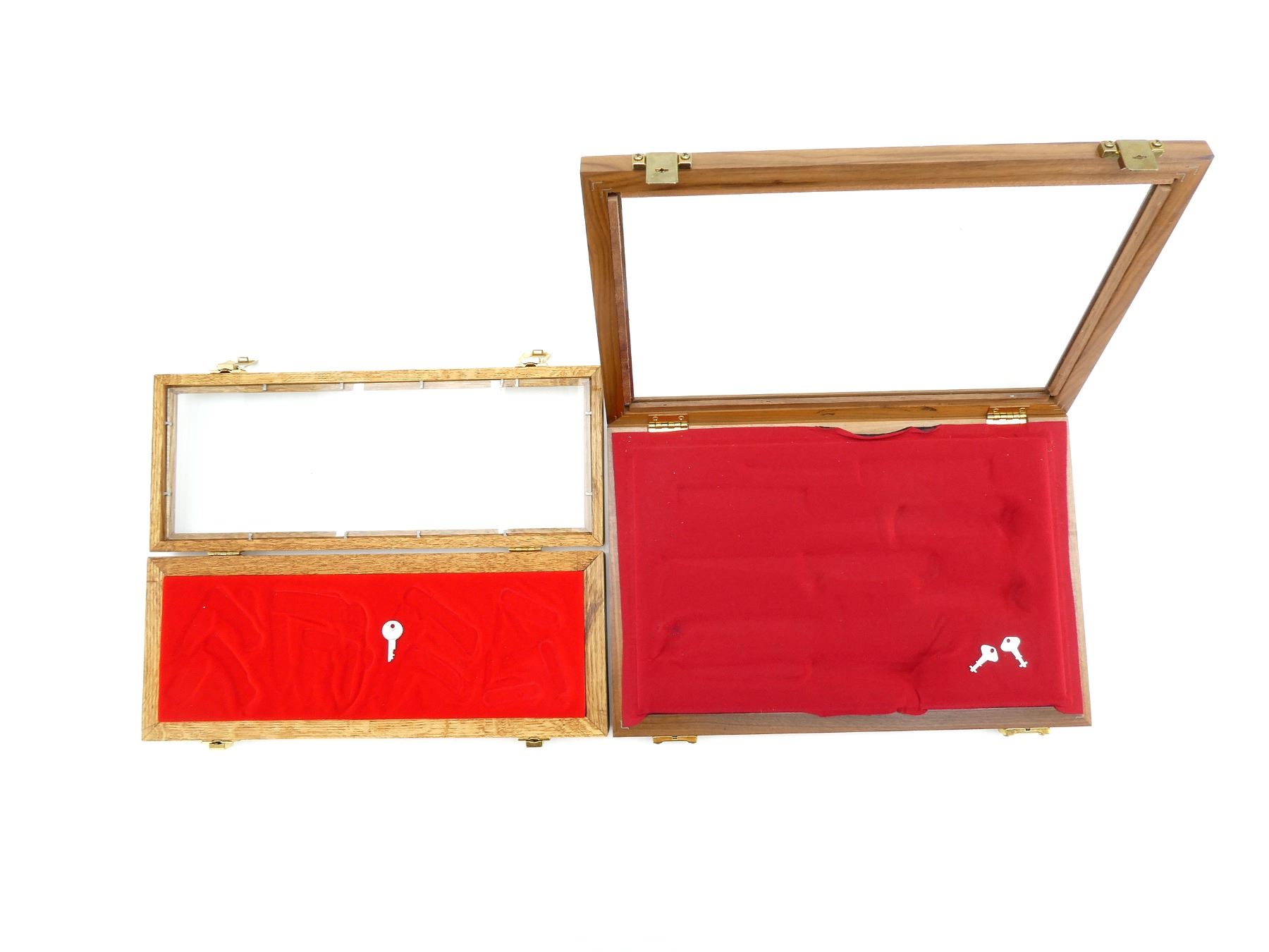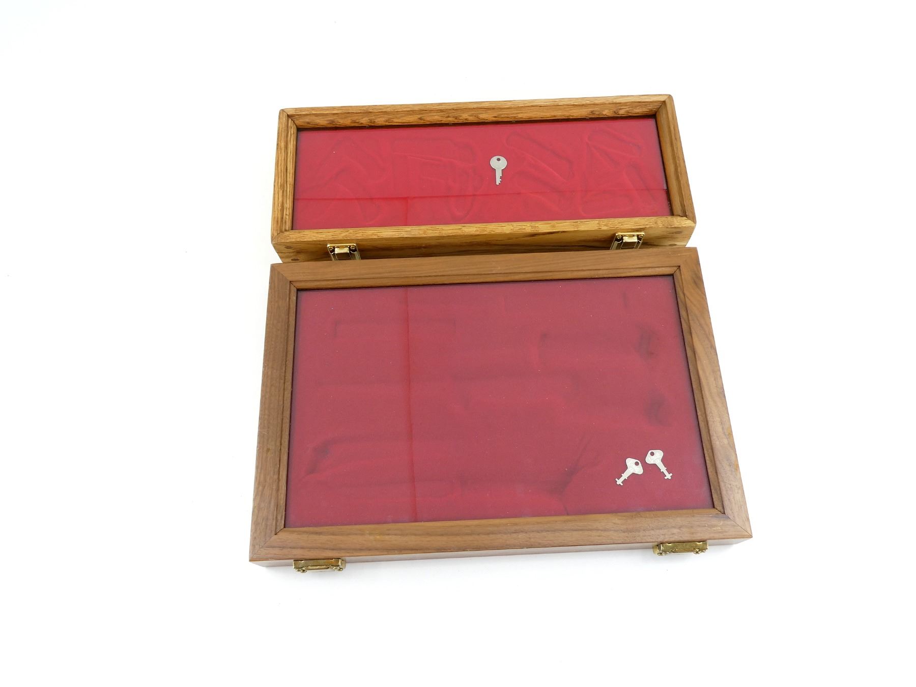 LOT INCLUDES; (1) GLASS DISPLAY CASE, WOOD / GLASS CONSTRUCTION, LATCH CLOSURE, RED FELT LINED / PADDED INTERIOR, LOCKABLE, WITH KEY, APPROX. 18" X 12" X 2 1/8" & (1) GLASS DISPLAY CASE, WOOD / GLASS CONSTRUCTION, LATCH CLOSURE, RED FELT LINED / PADDED INTERIOR, LOCKABLE, WITH KEY, APPROX. 18" X 7" X 2.5". SEE PHOTOS. *NO GUARANTEE ON GLASS FOR SHIPPING*