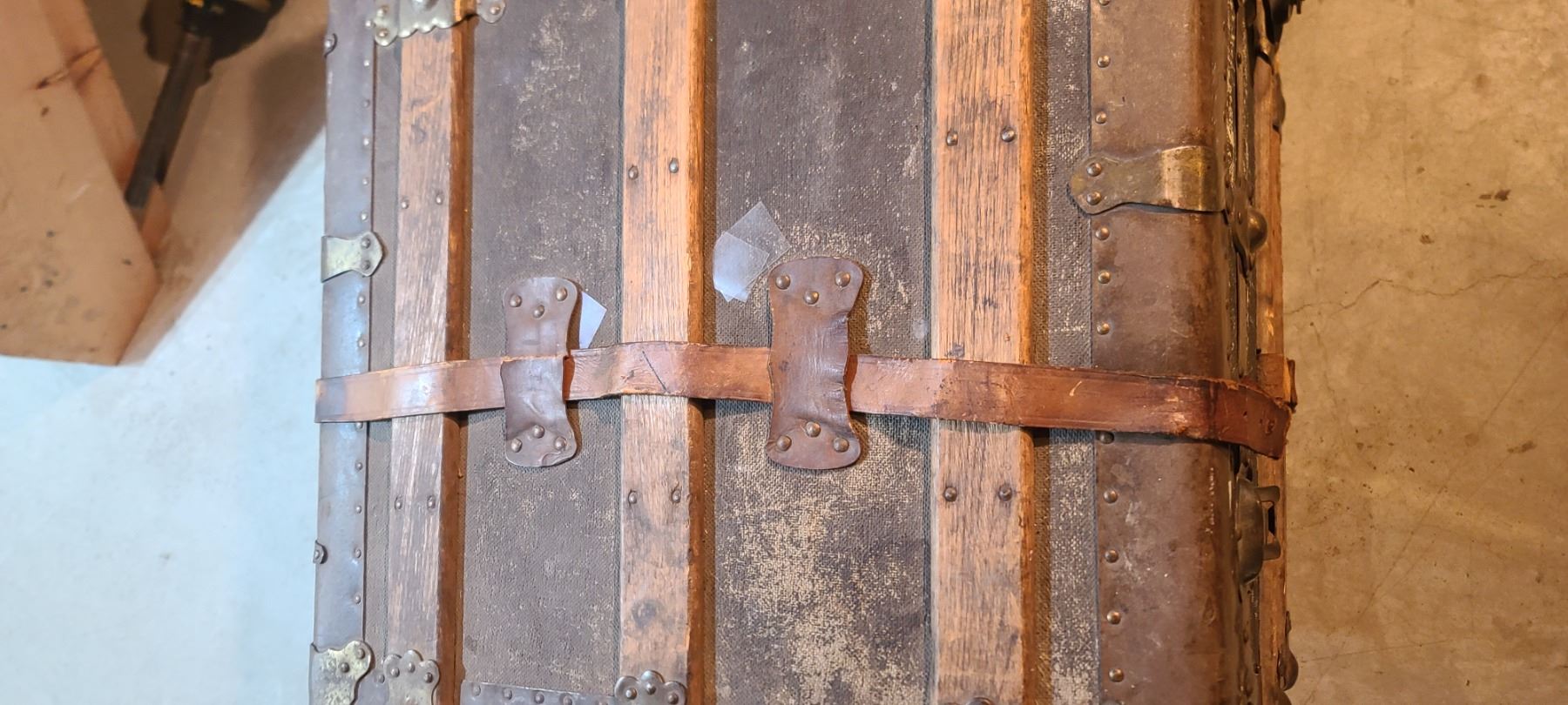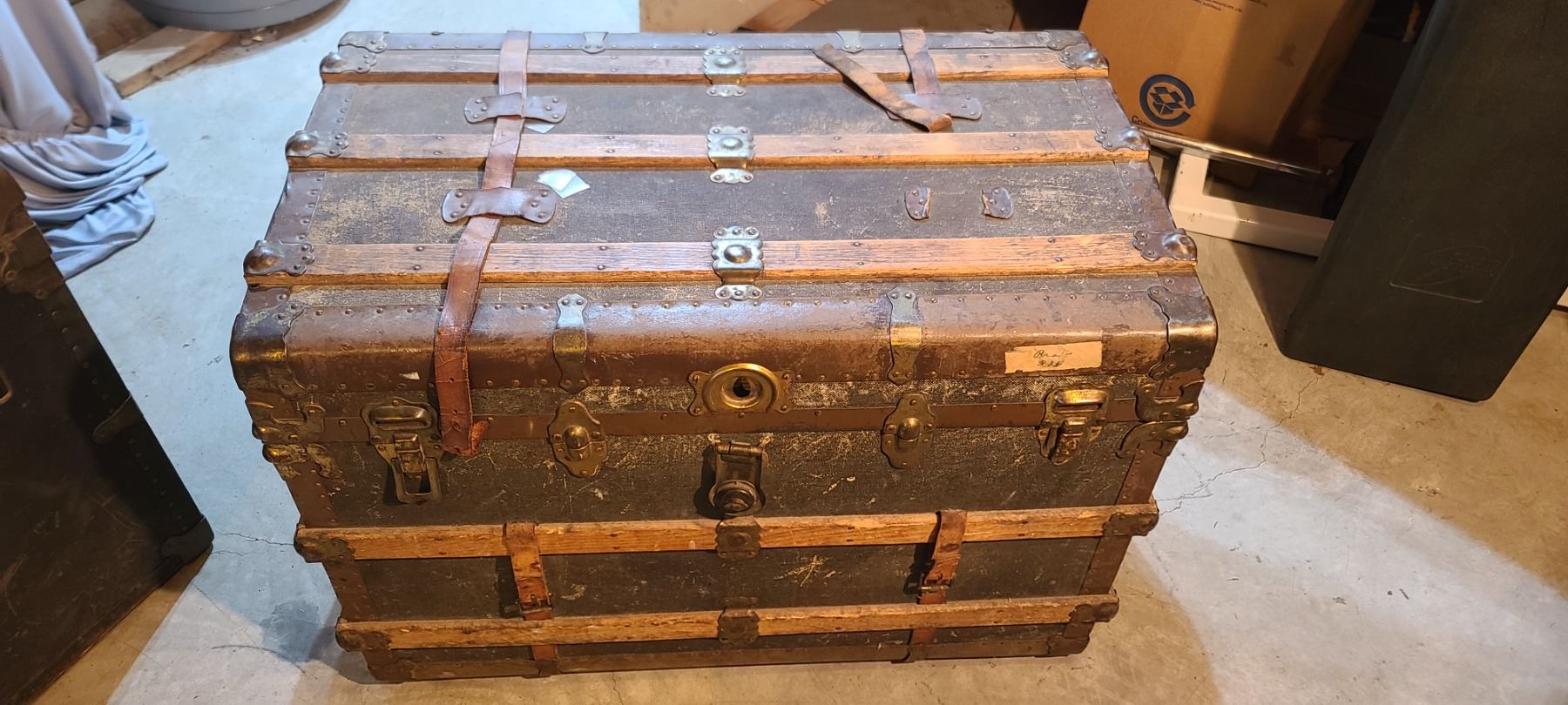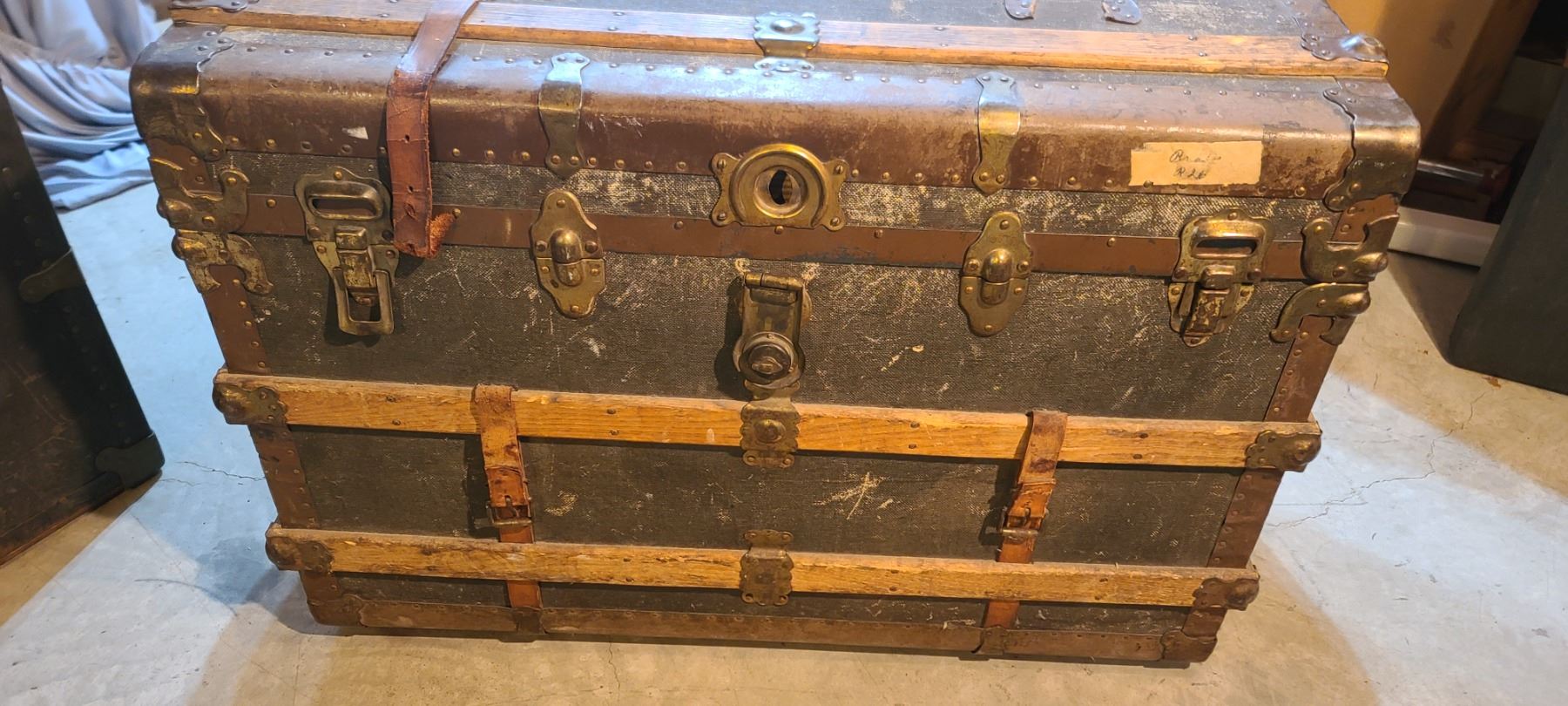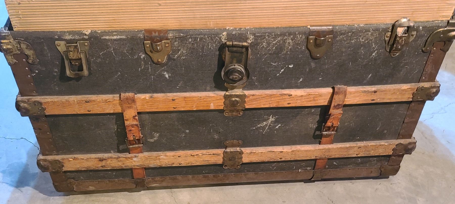 WOOD AND LEATHER STRAPPED STEAMER TRUNK 35 X 21 X 24"
