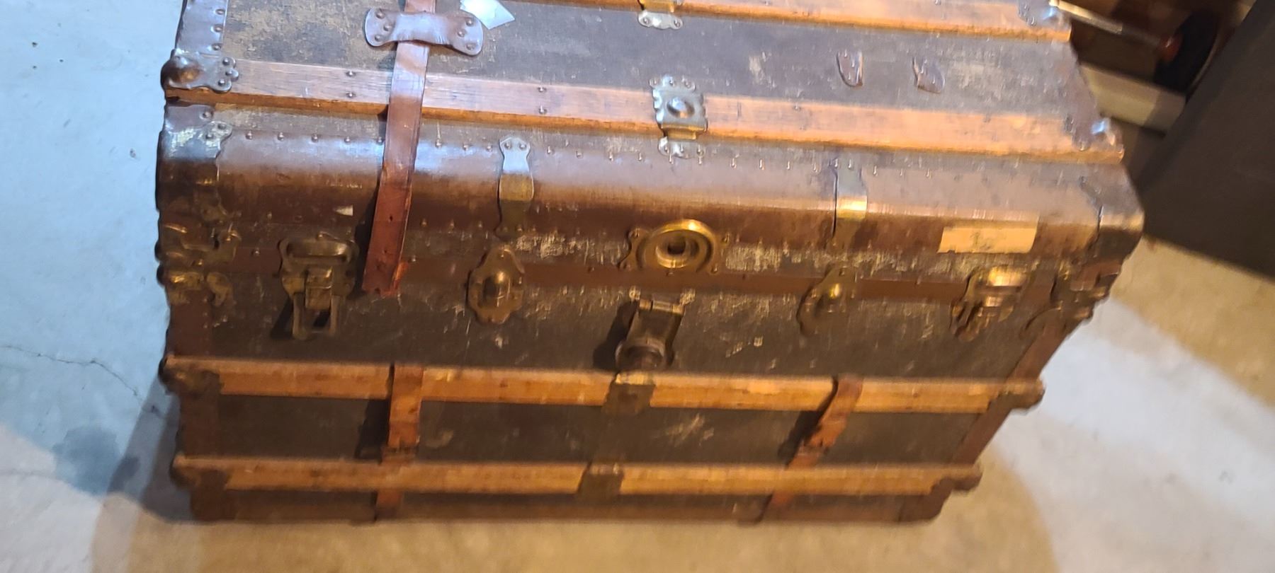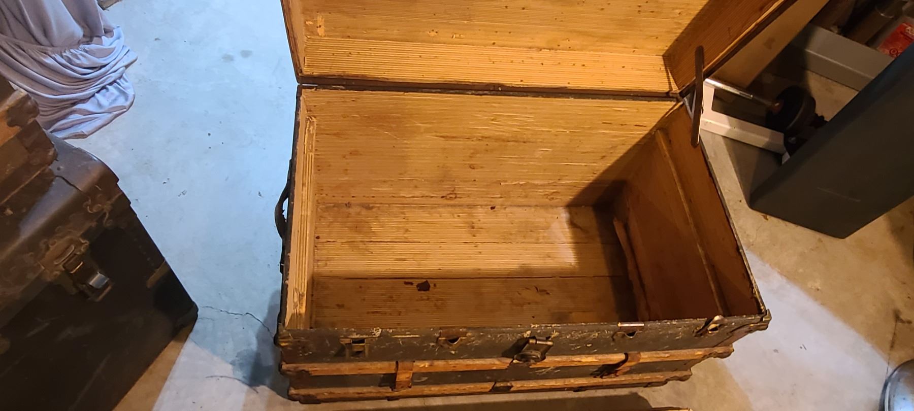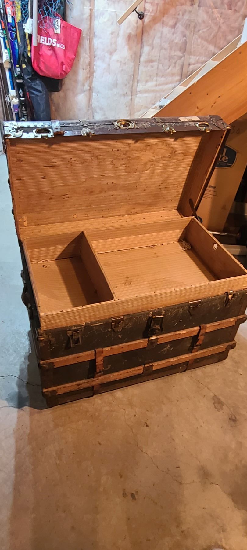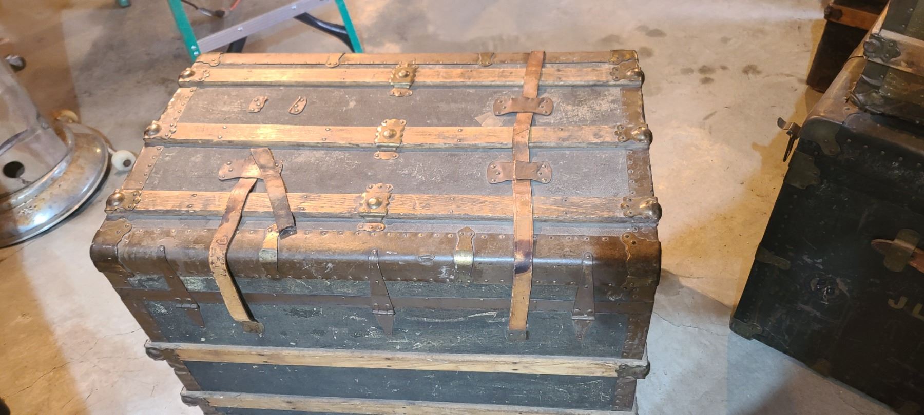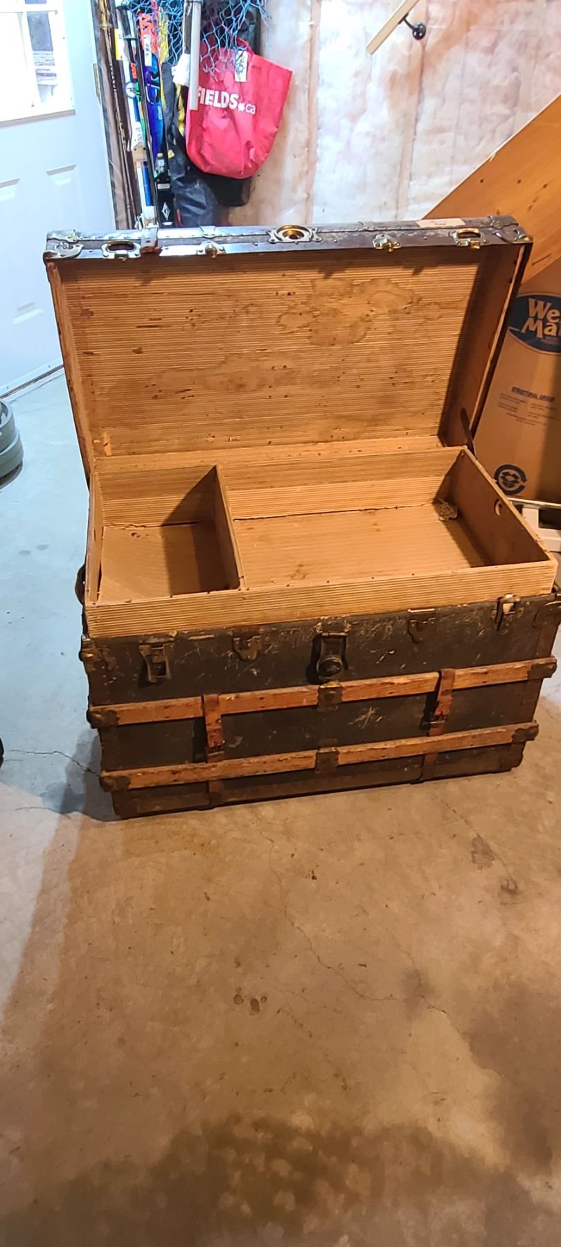 WOOD AND LEATHER STRAPPED STEAMER TRUNK 35 X 21 X 24"