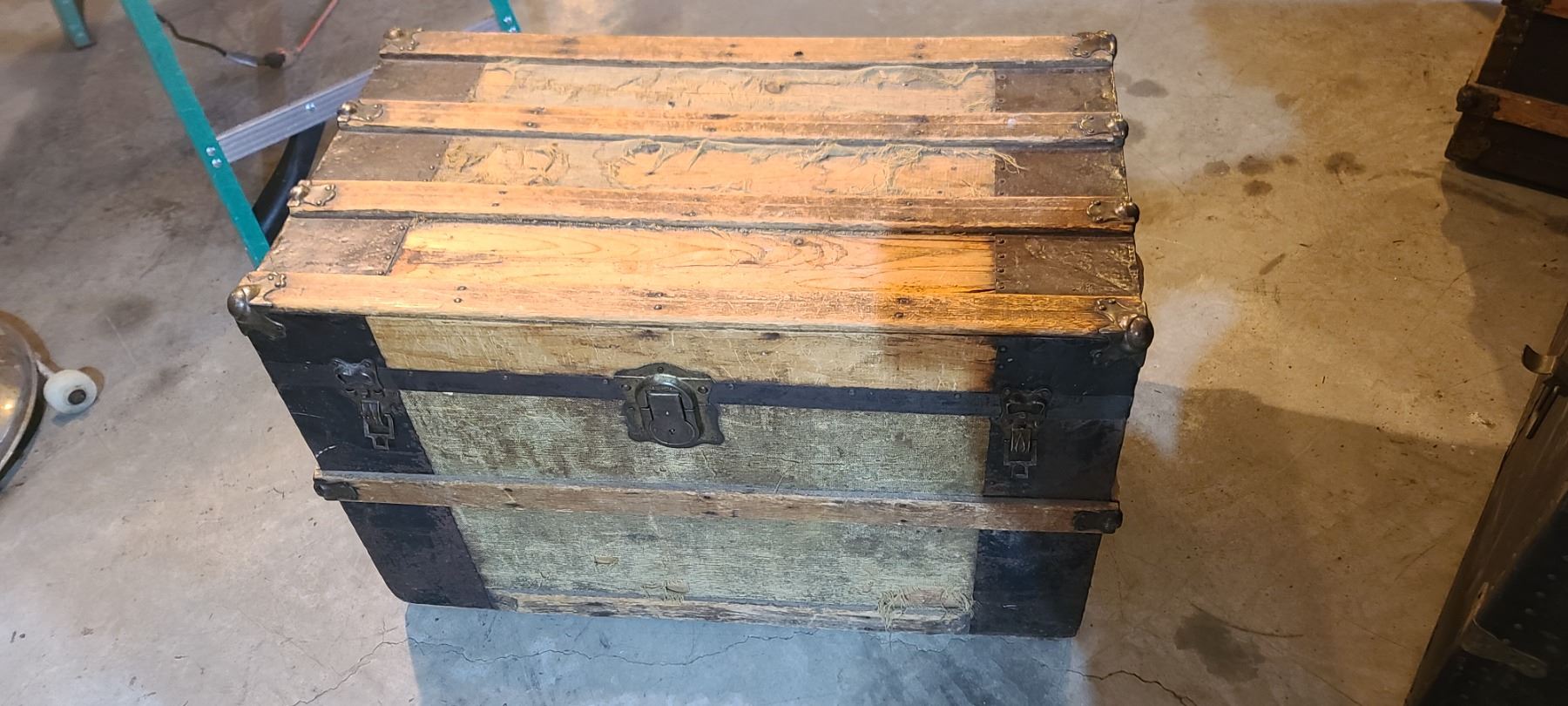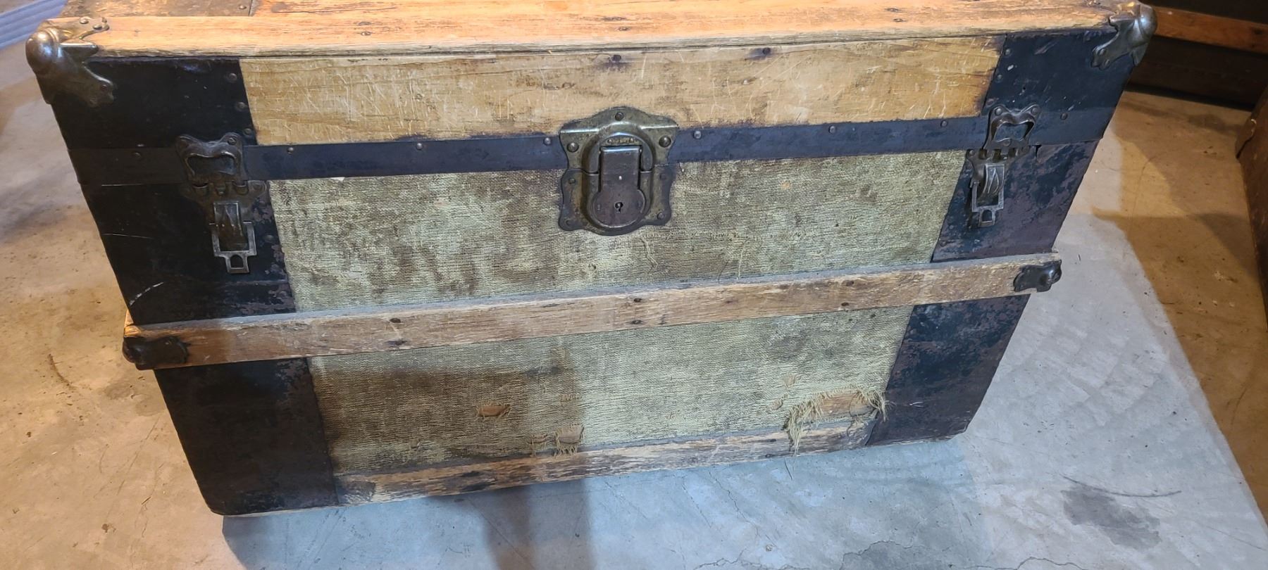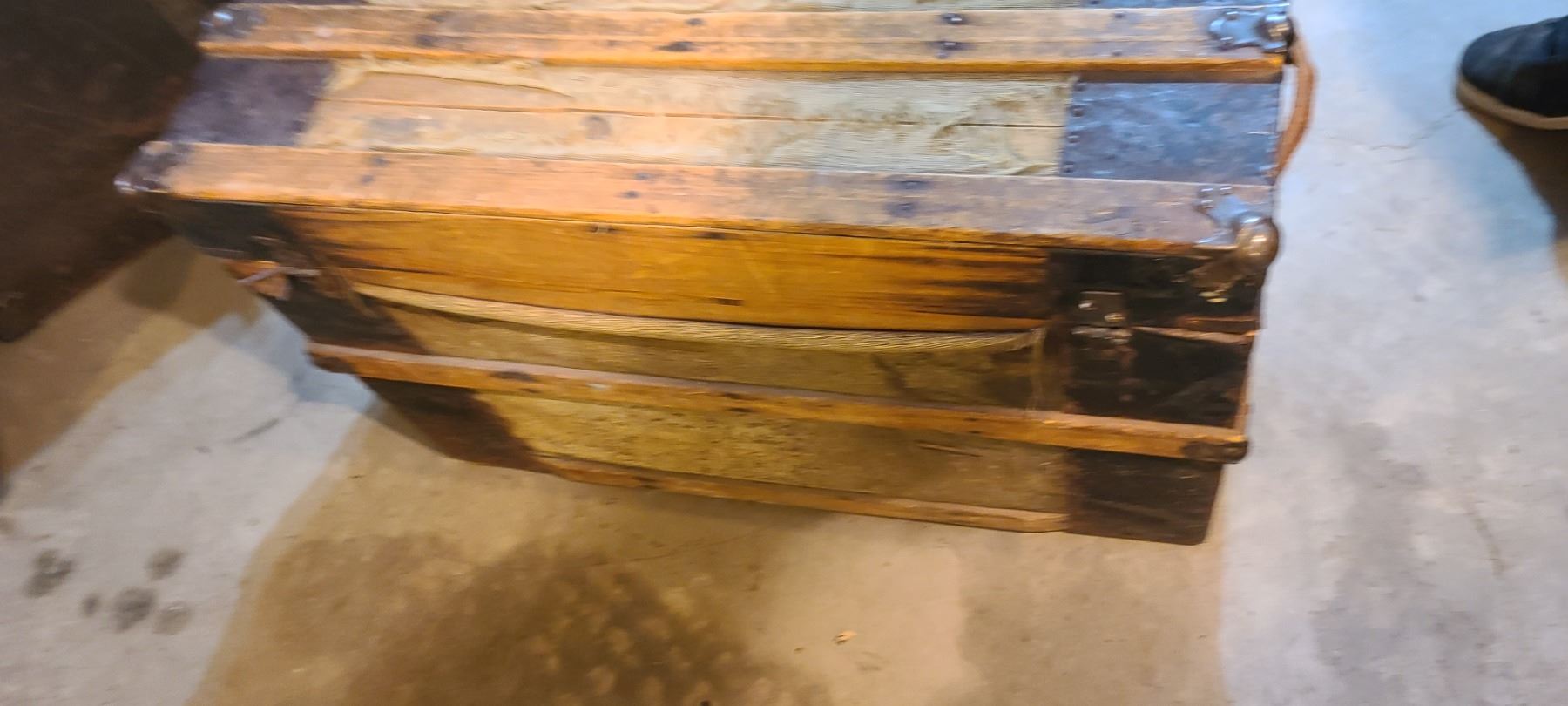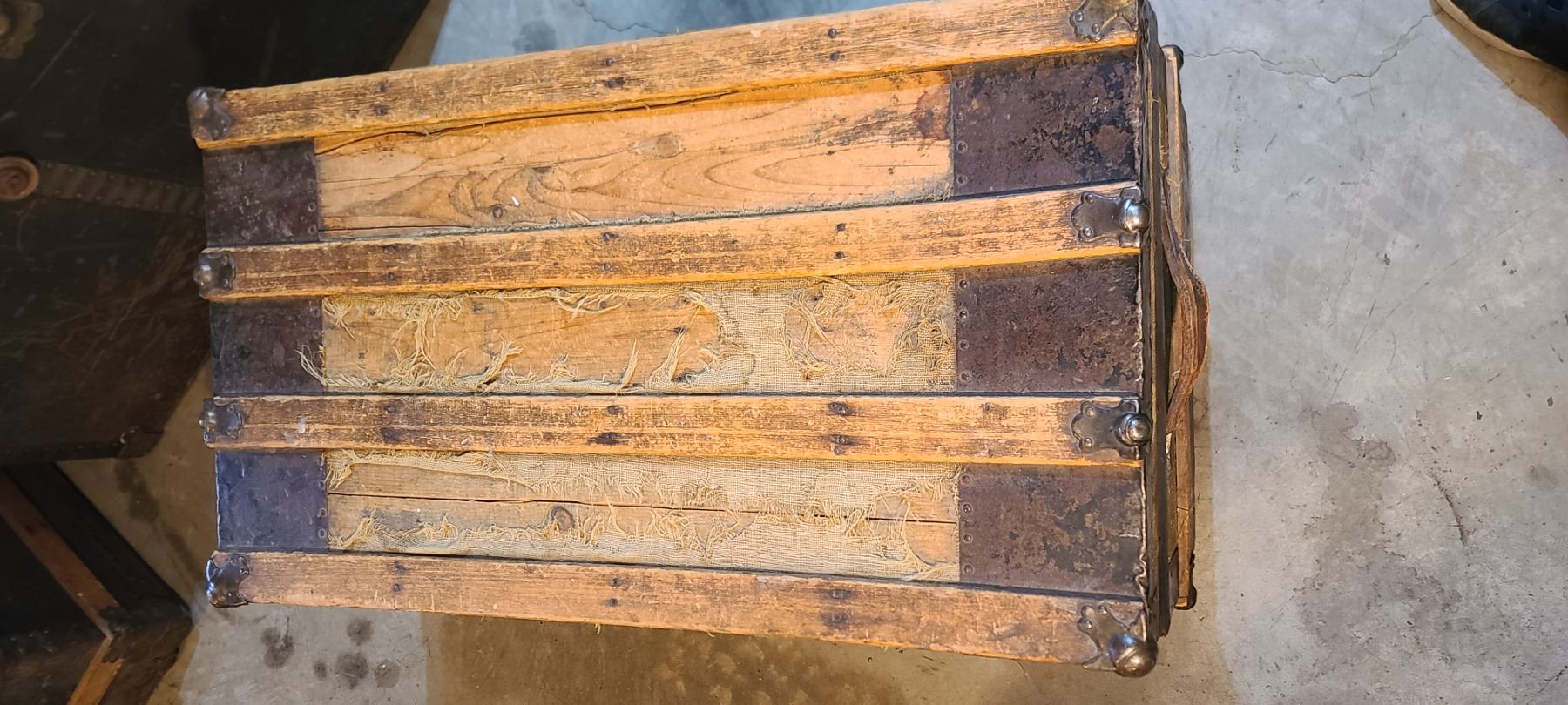 WOOD AND METAL STRAPPED STEAMER TRUNK 32 X18 21" COMES WITH X-MAS TREE LIGHTS