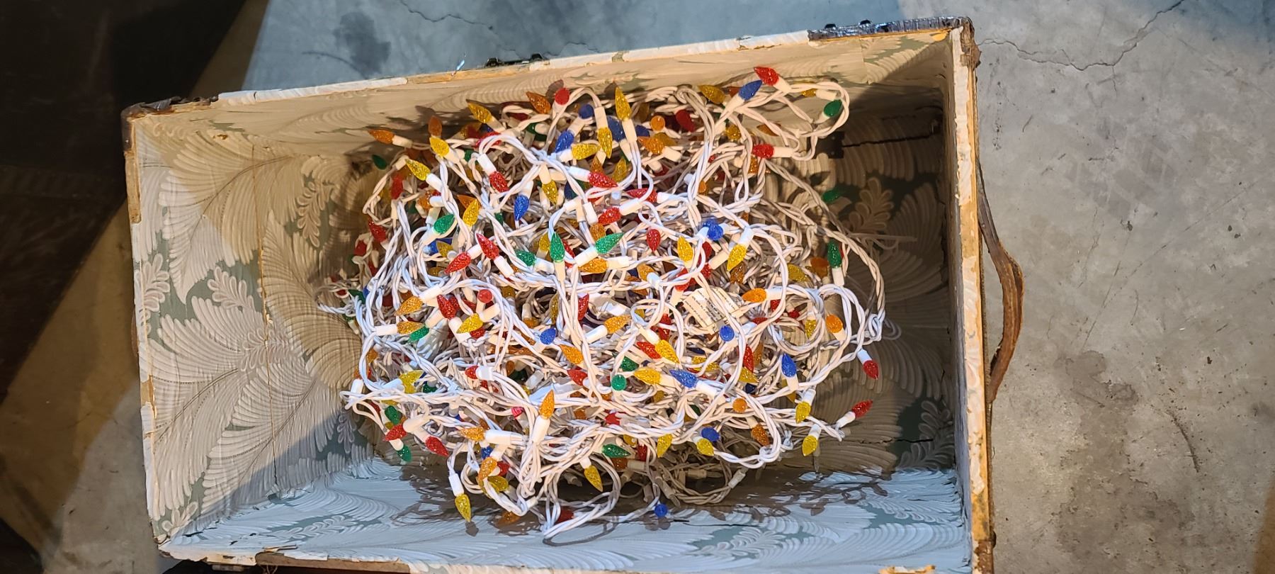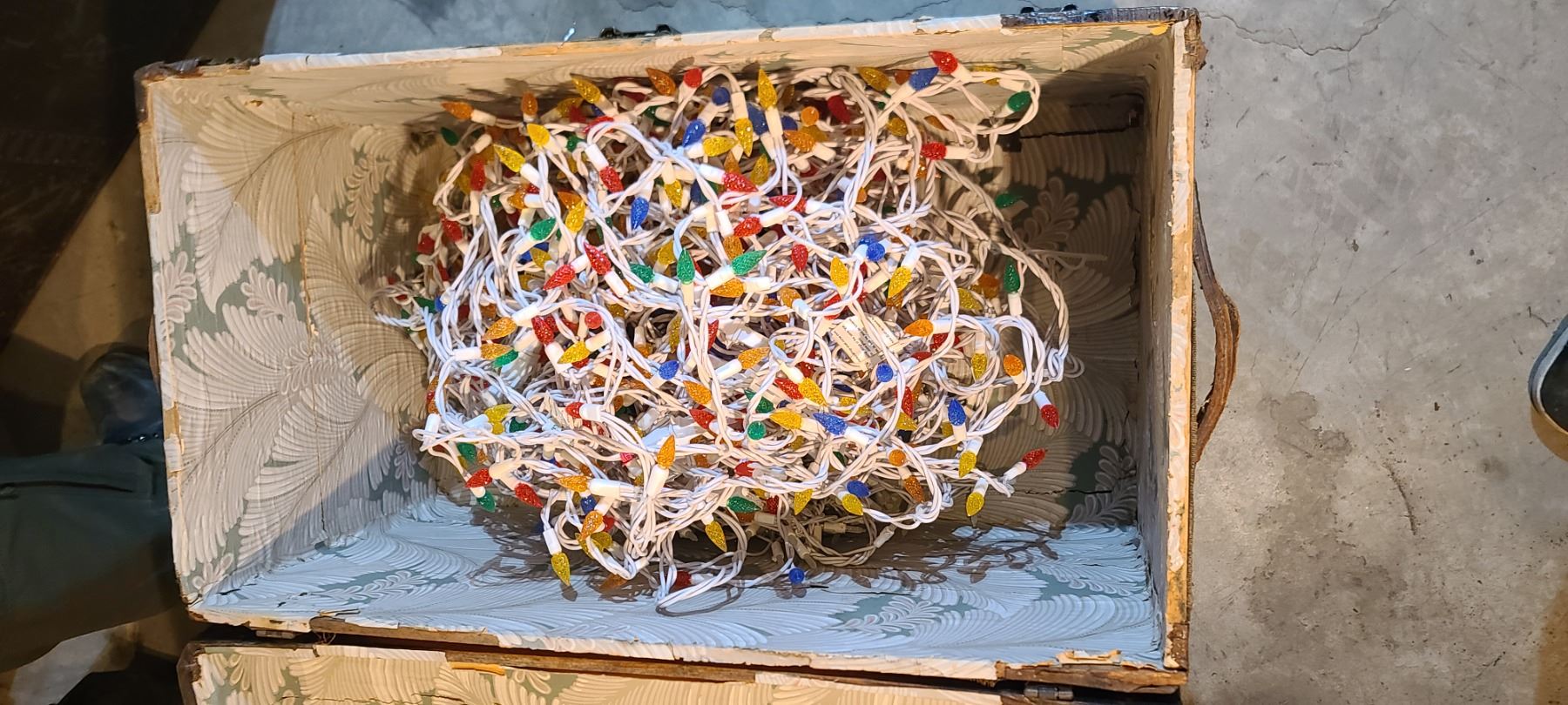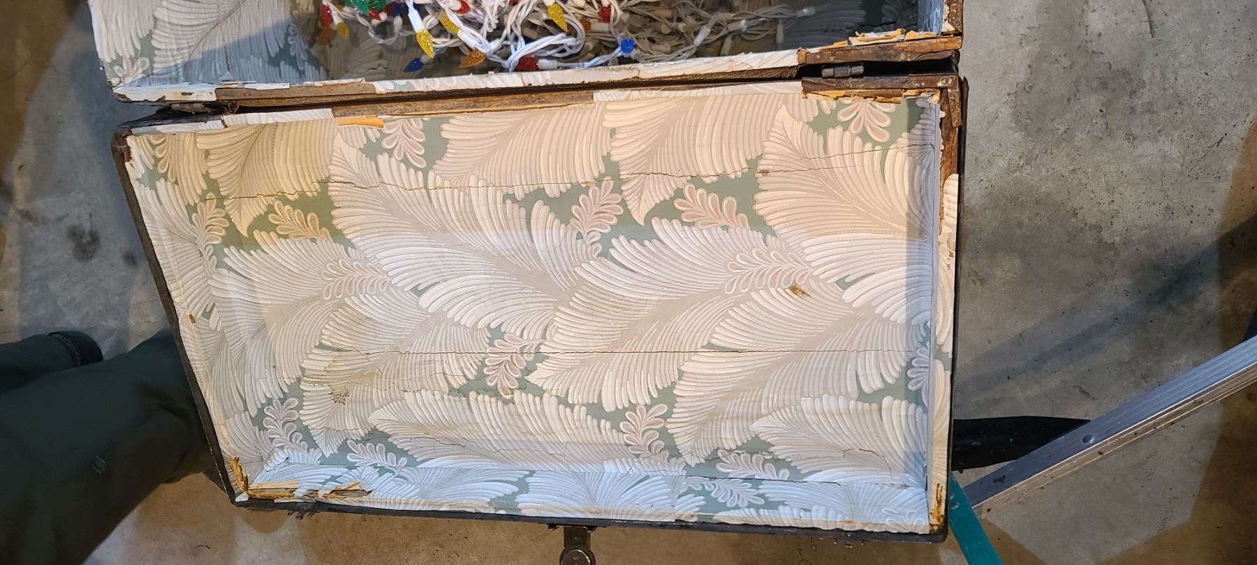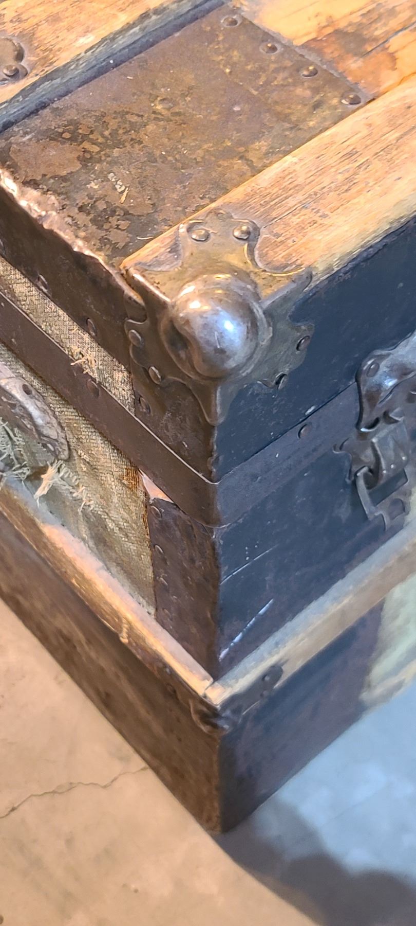 WOOD AND METAL STRAPPED STEAMER TRUNK 32 X18 21" COMES WITH X-MAS TREE LIGHTS