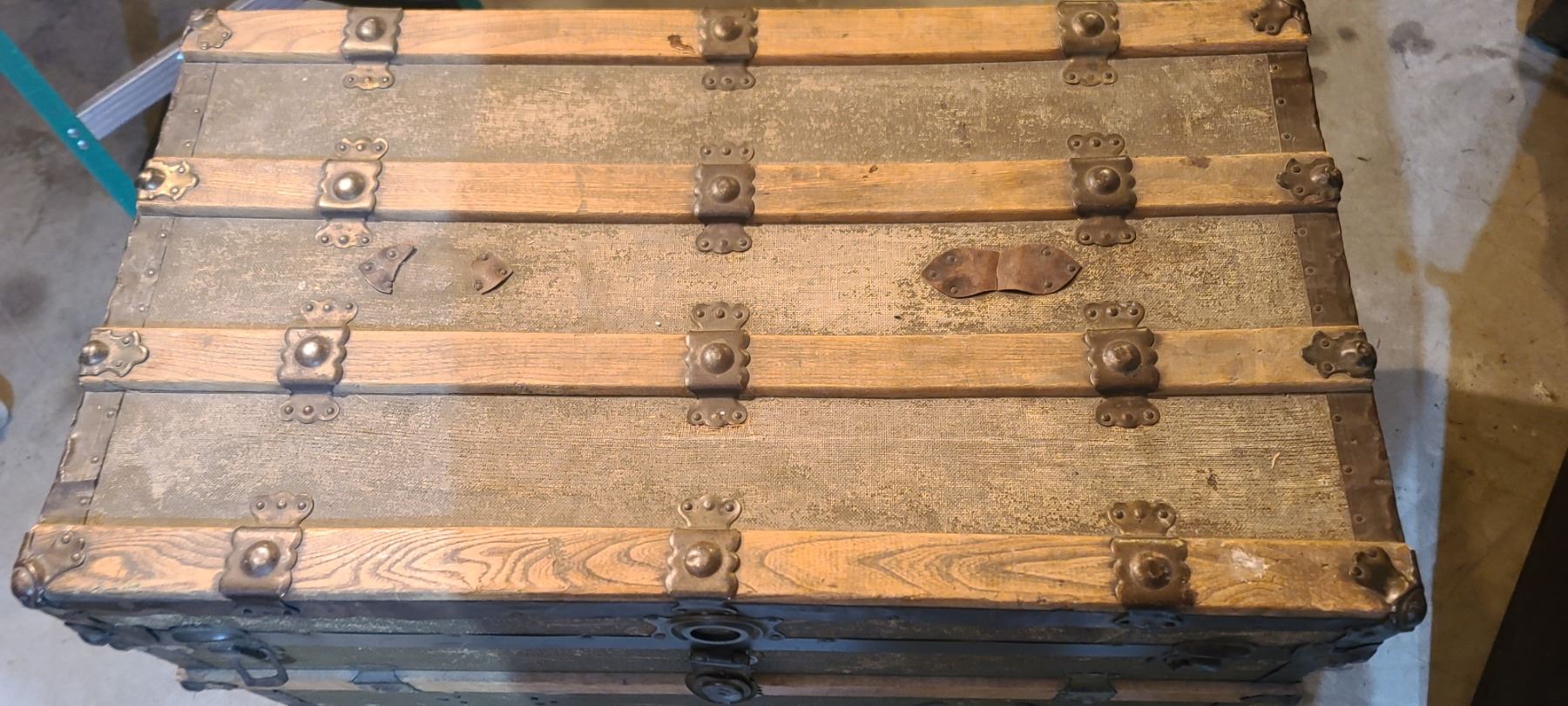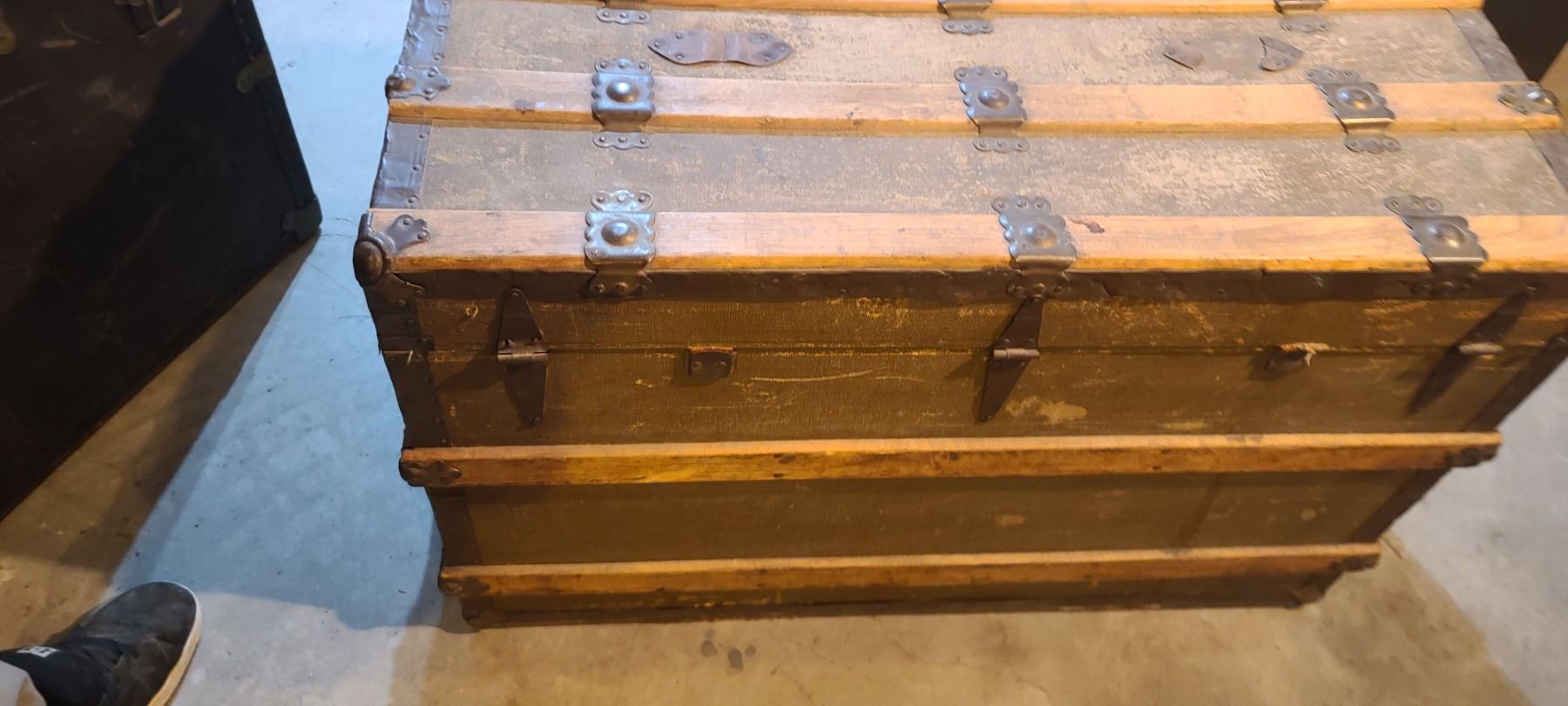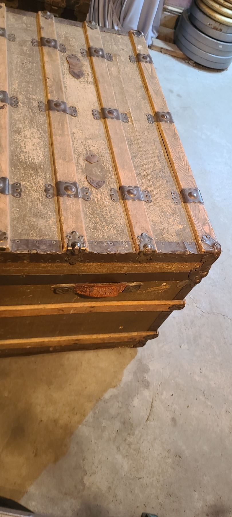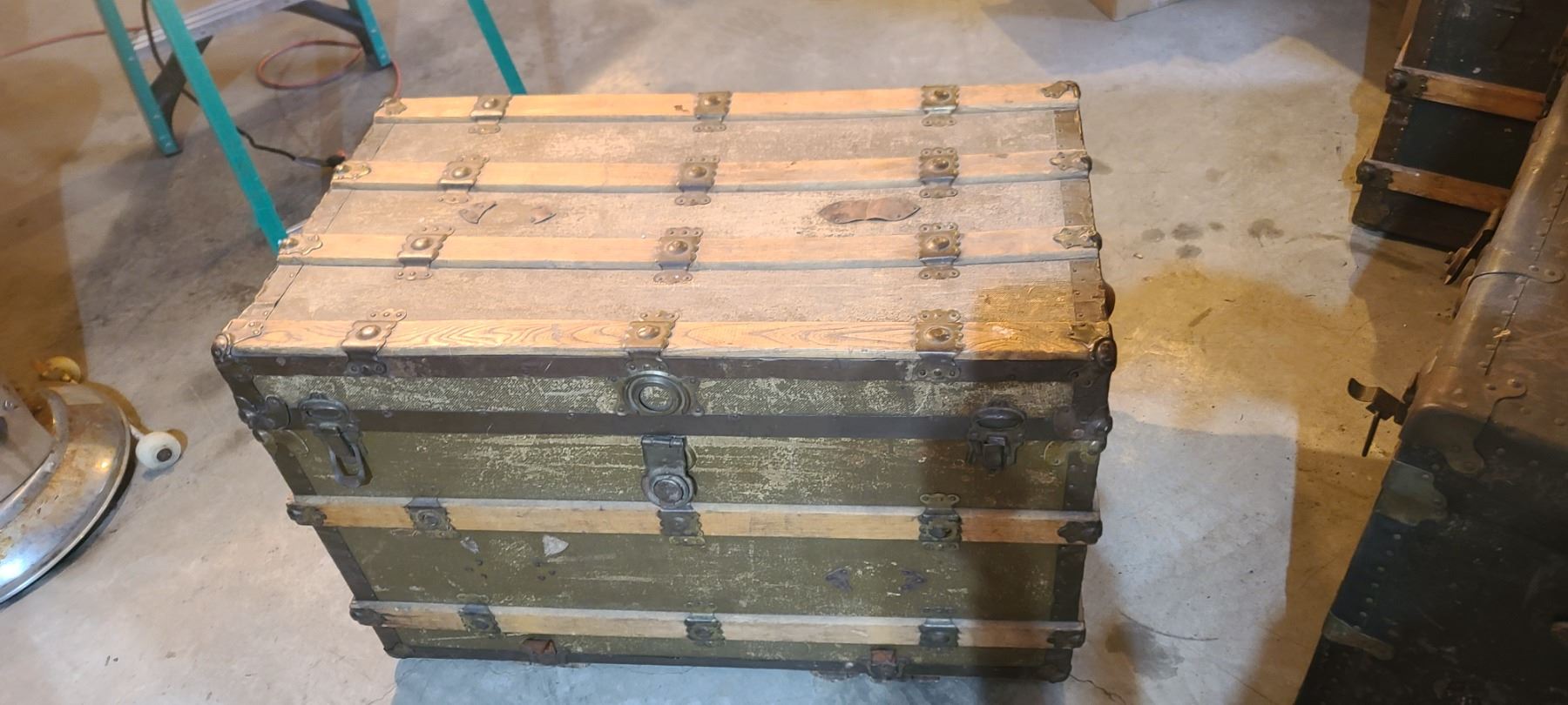 WOOD AND METAL STRAPPED STEAMER TRUNK 36 X 20 X 23