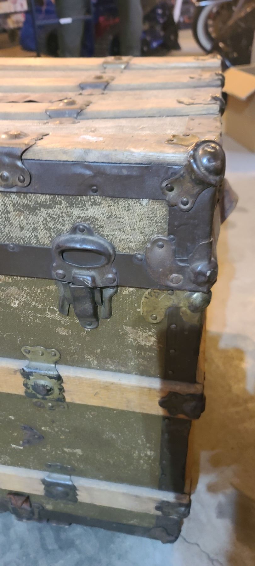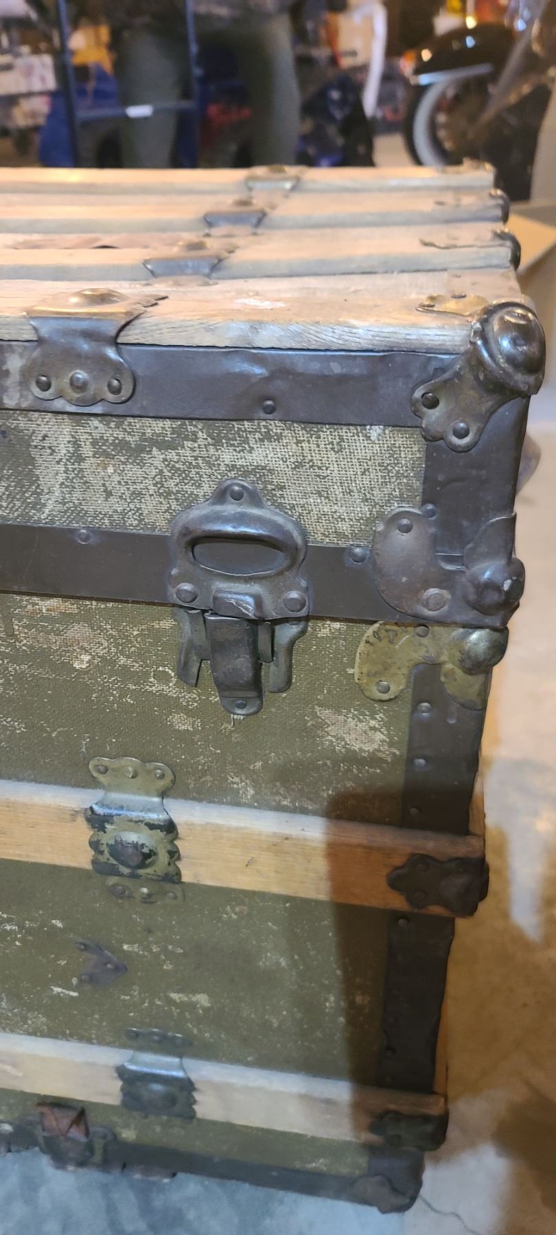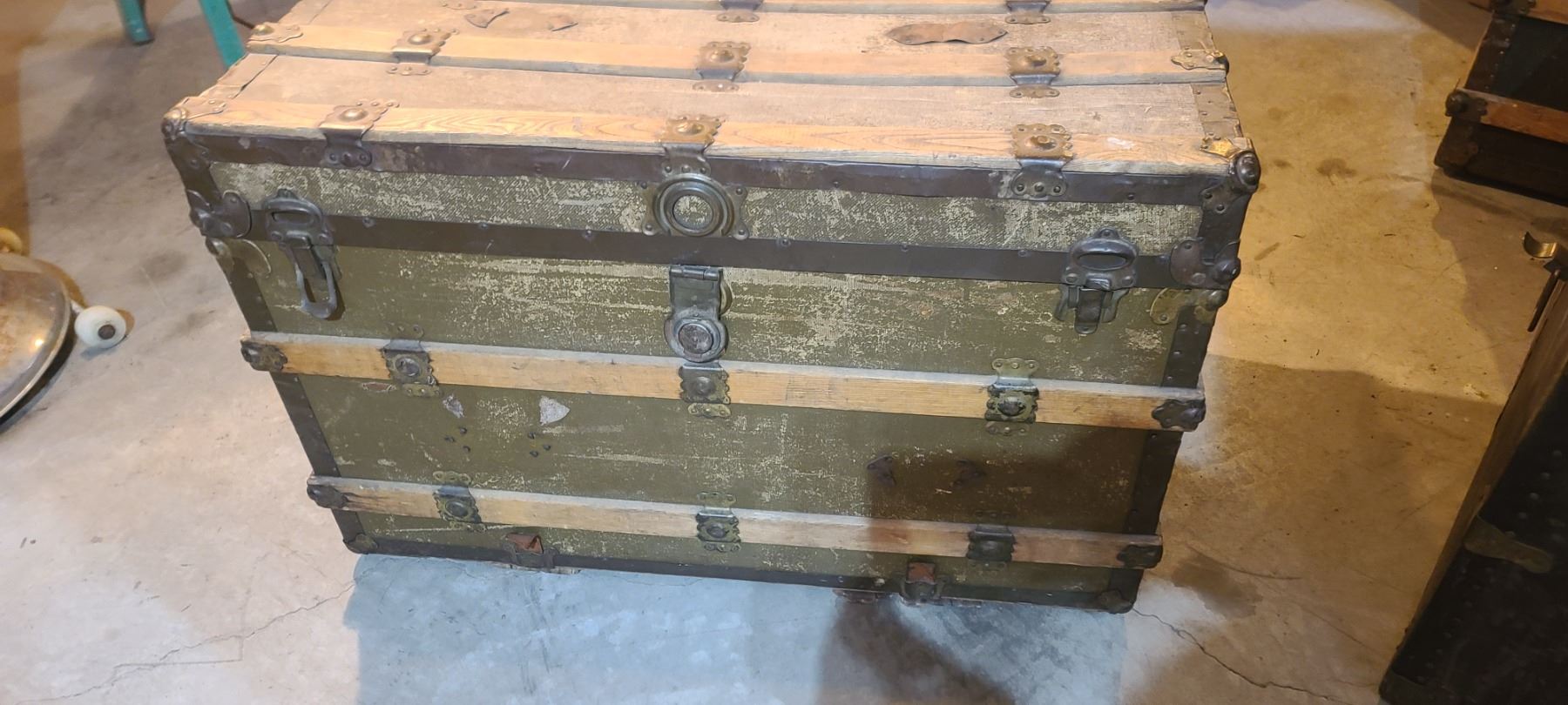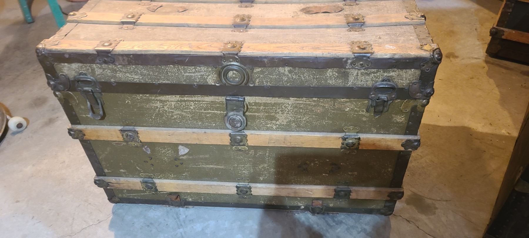WOOD AND METAL STRAPPED STEAMER TRUNK 36 X 20 X 23