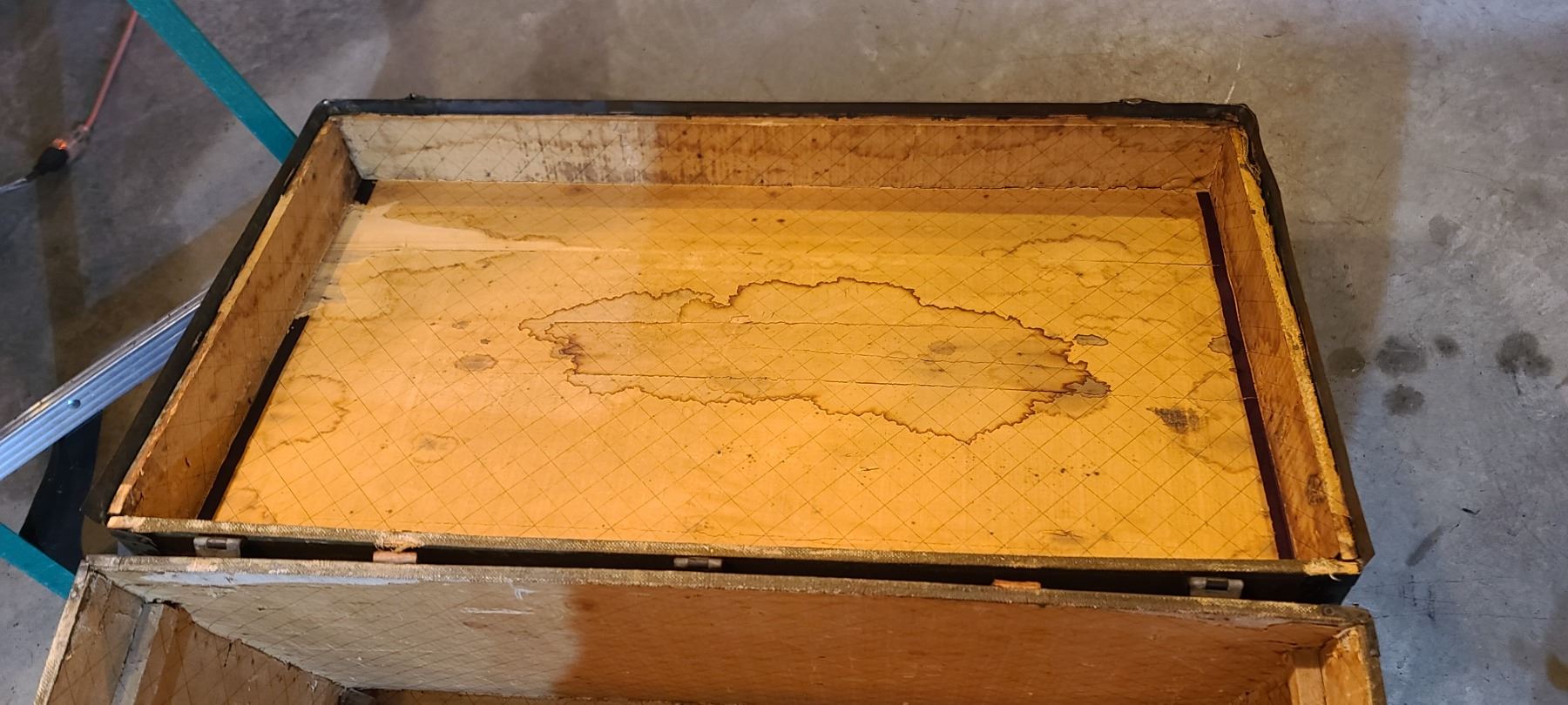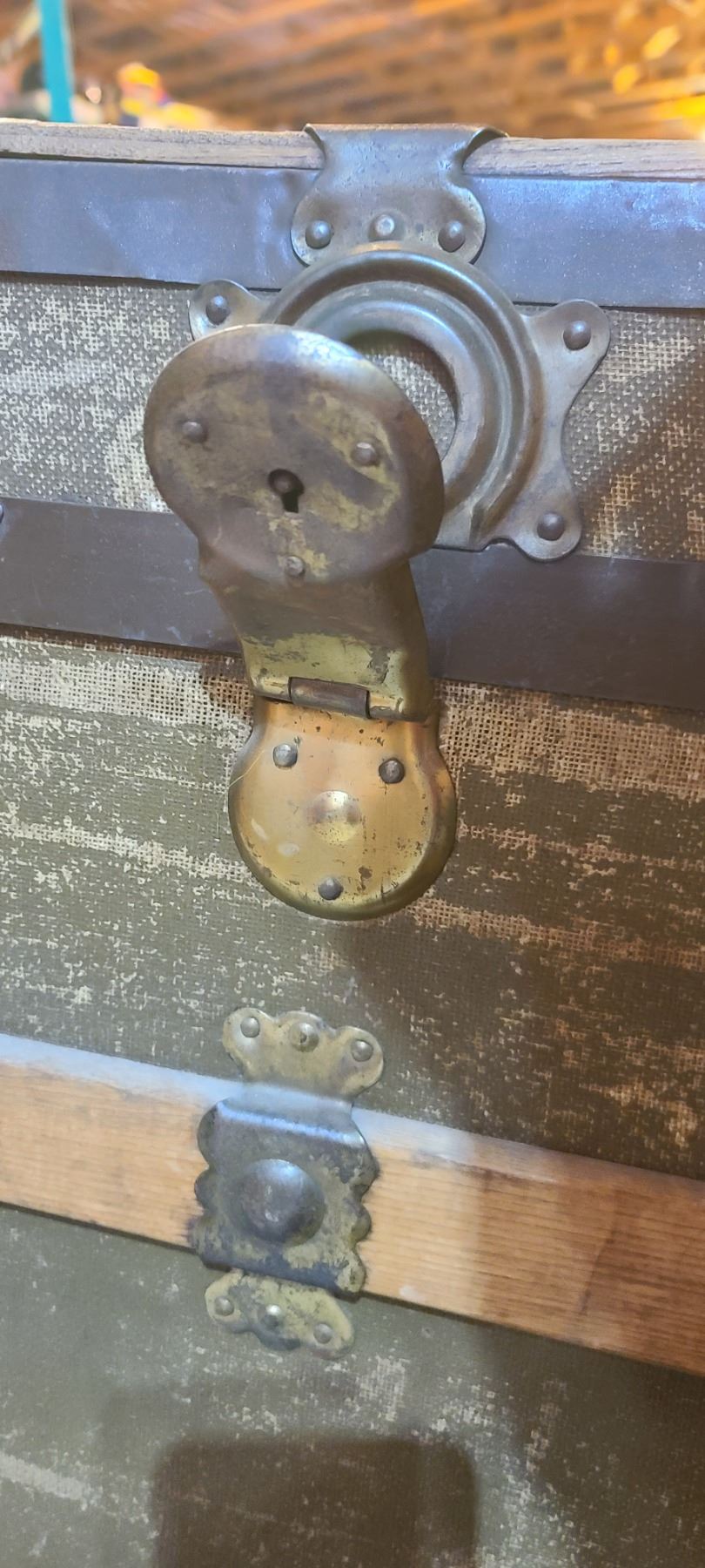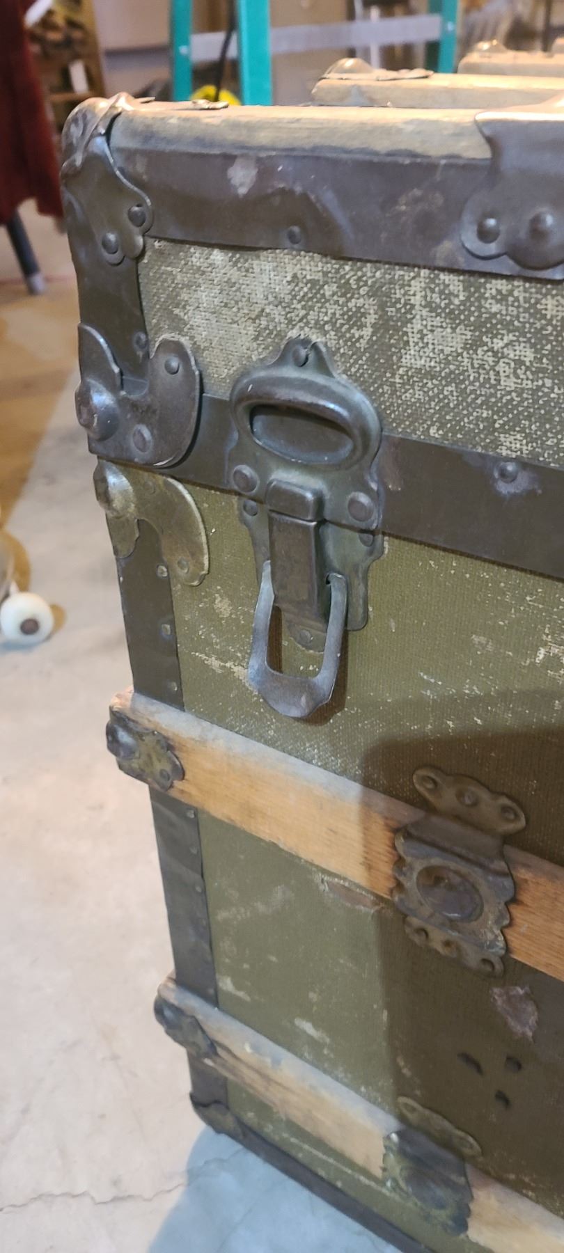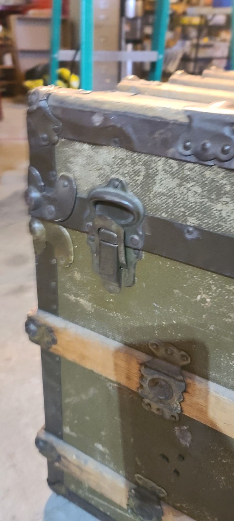 WOOD AND METAL STRAPPED STEAMER TRUNK 36 X 20 X 23