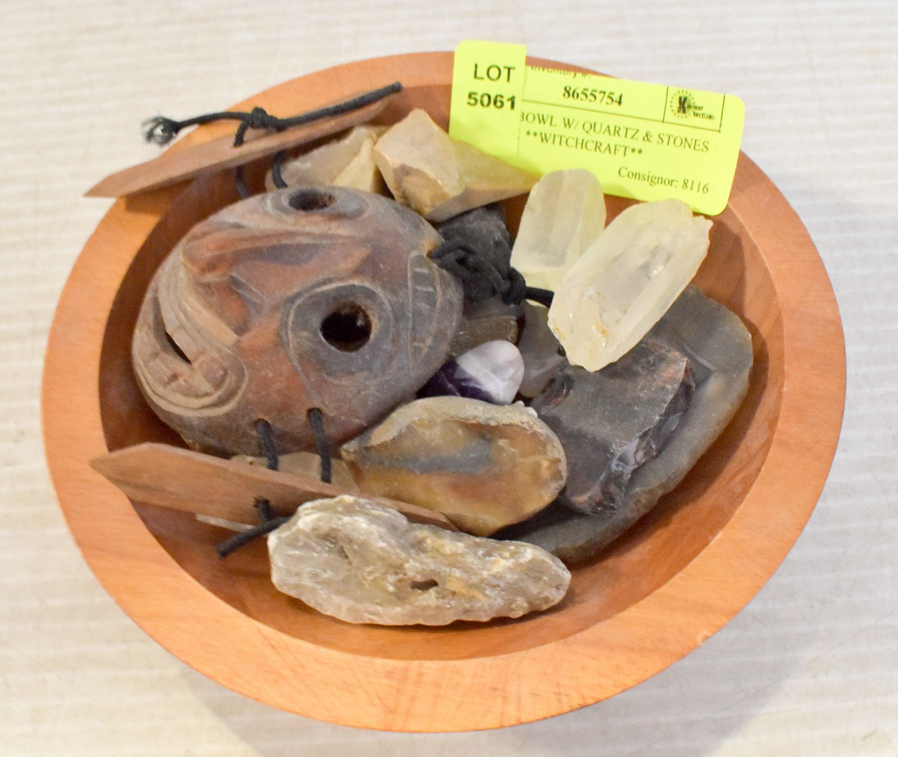 WOOD BOWL W/ QUARTZ & STONES & MASK **WITCHCRAFT**