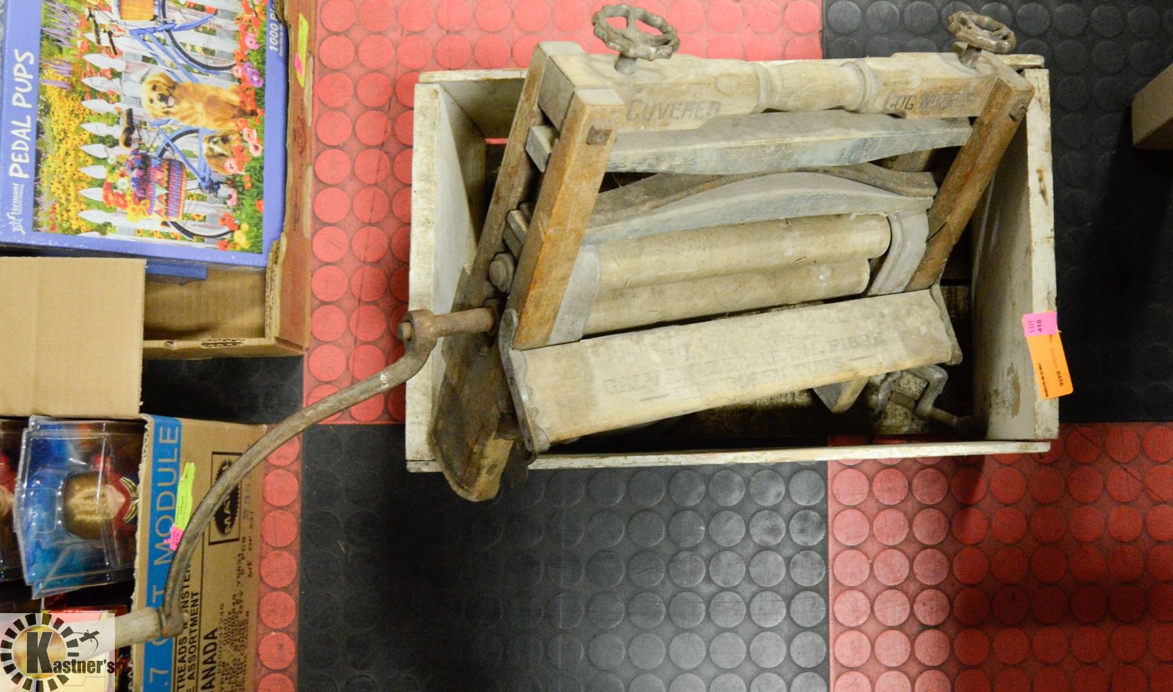 WOOD BOX WITH ANTIQUE WRINGER AND KETTLE