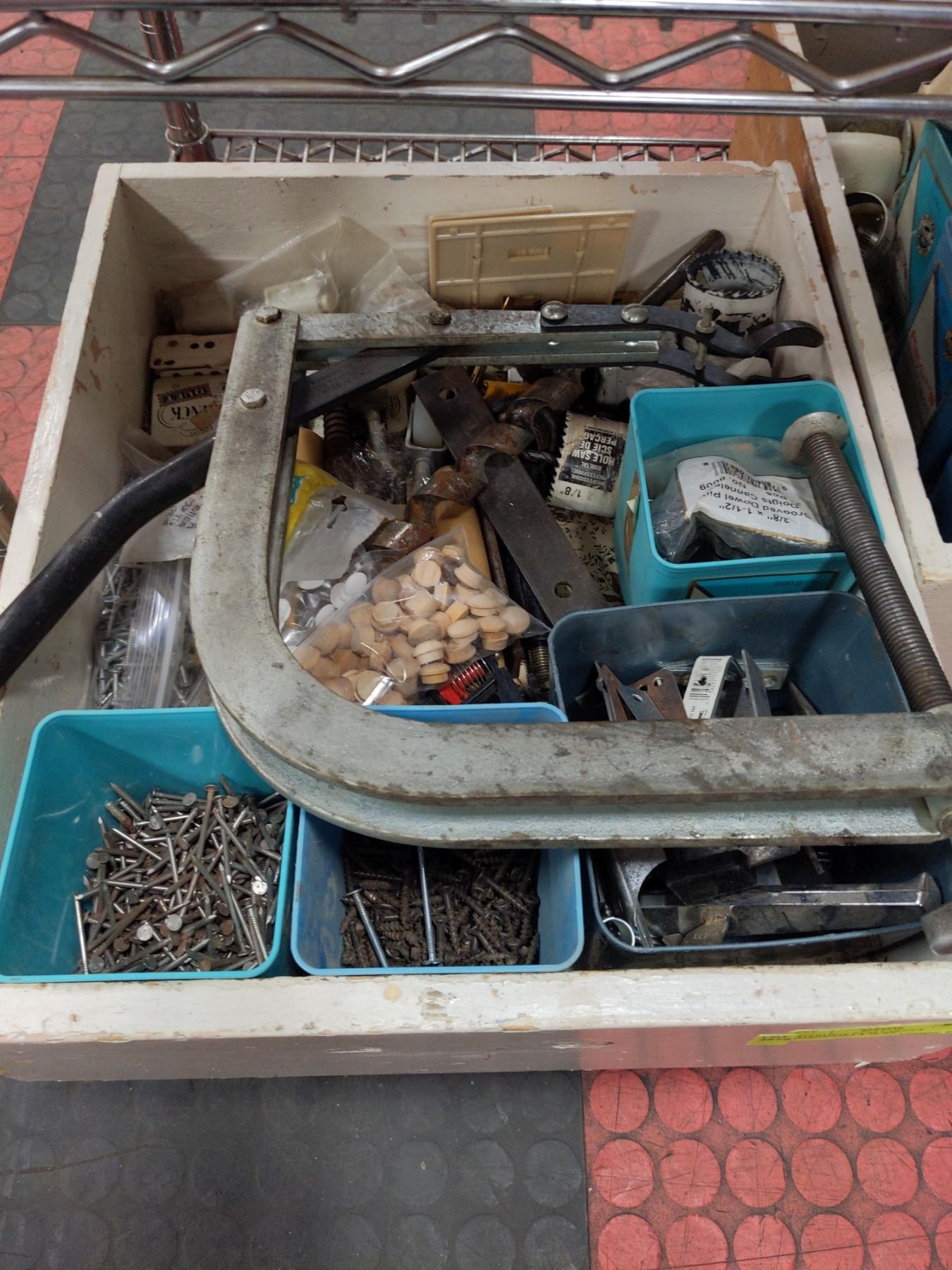WOOD BOX WITH VARIOUS HARDWARES & MORE