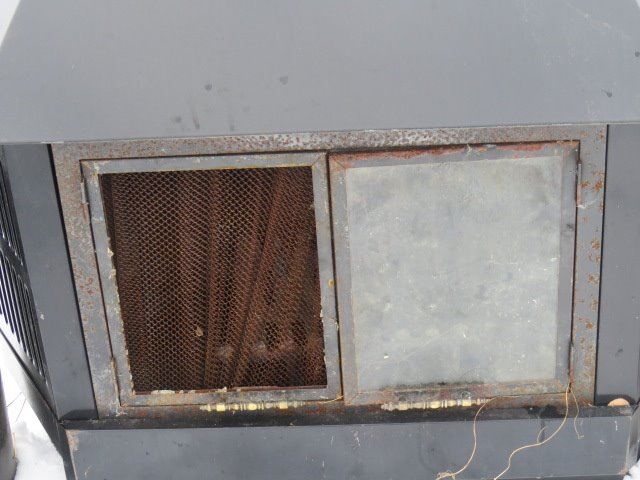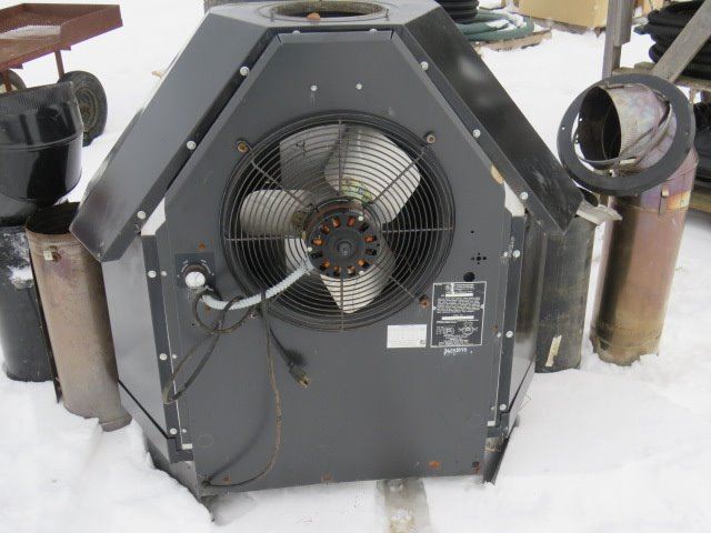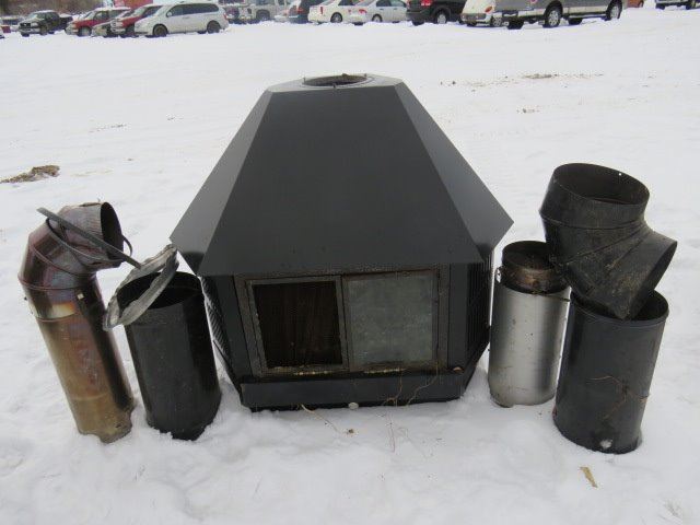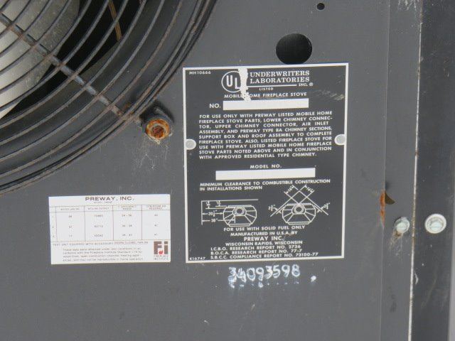 WOOD BURNING STOVE, W/CHIMNEY PIPE, ELECTRIC FAN, 1 GLASS DOOR BROKEN, PREWAY INC.