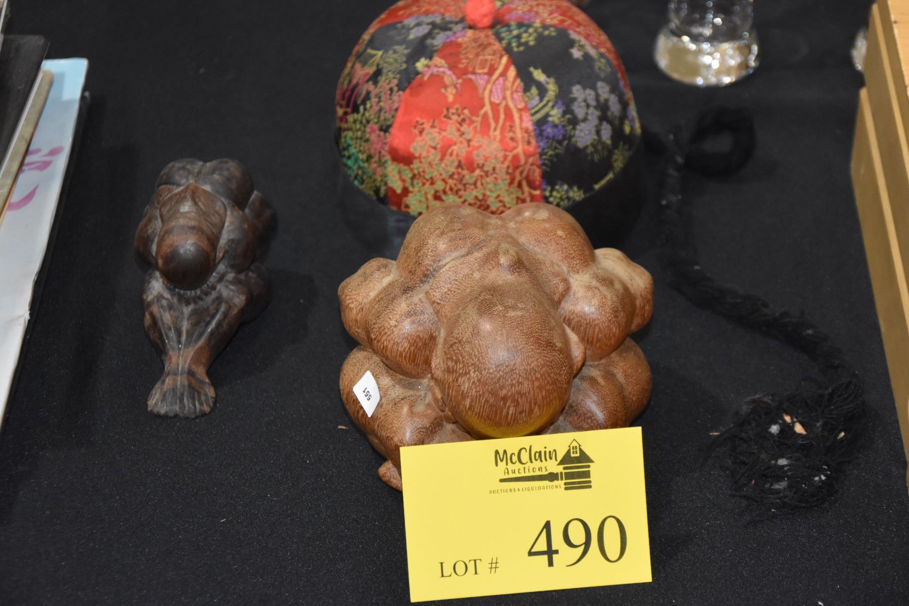 WOOD CARVED STATUARY & CHINESE HAT (3 PCS)