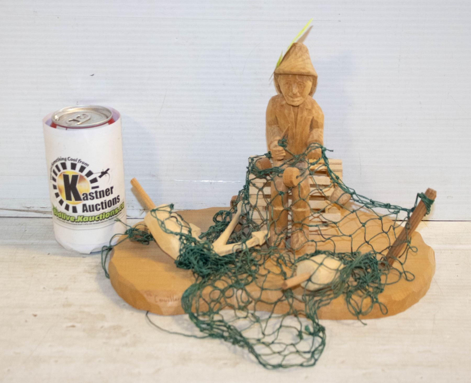 WOOD CARVING FISHERMAN WITH NET AND TOOLS