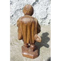 8" tall Wood carving of oriental man with humped back carrying bottle with satchels slung over each arm.