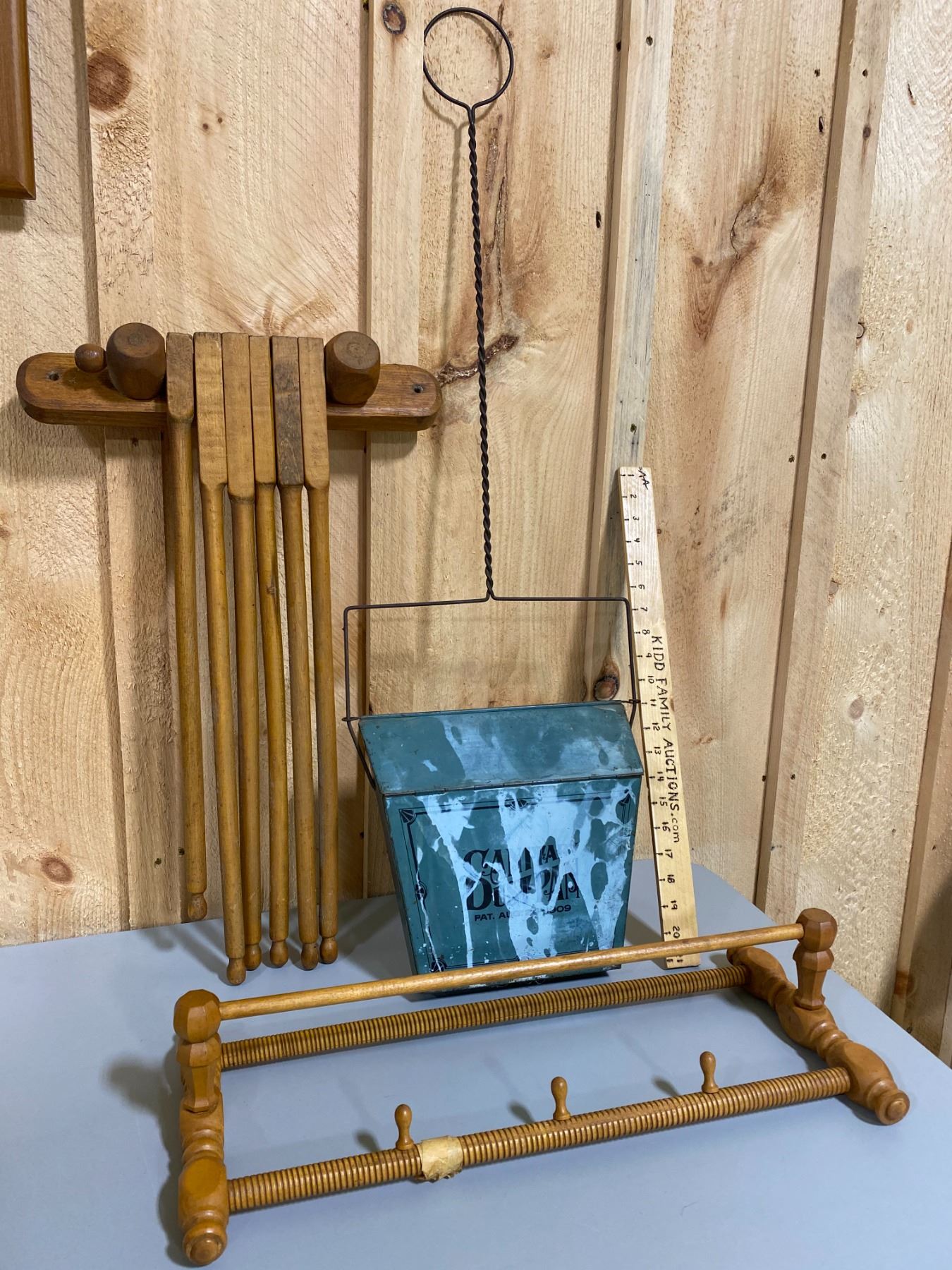 WOOD CLOTHES DRYER, TOWEL HOLDER & TIN DUST BIN