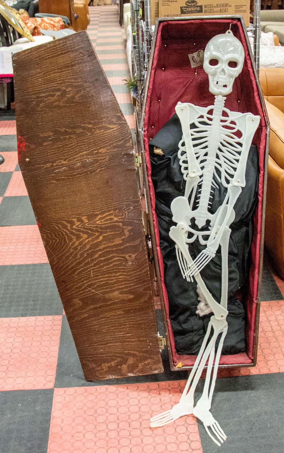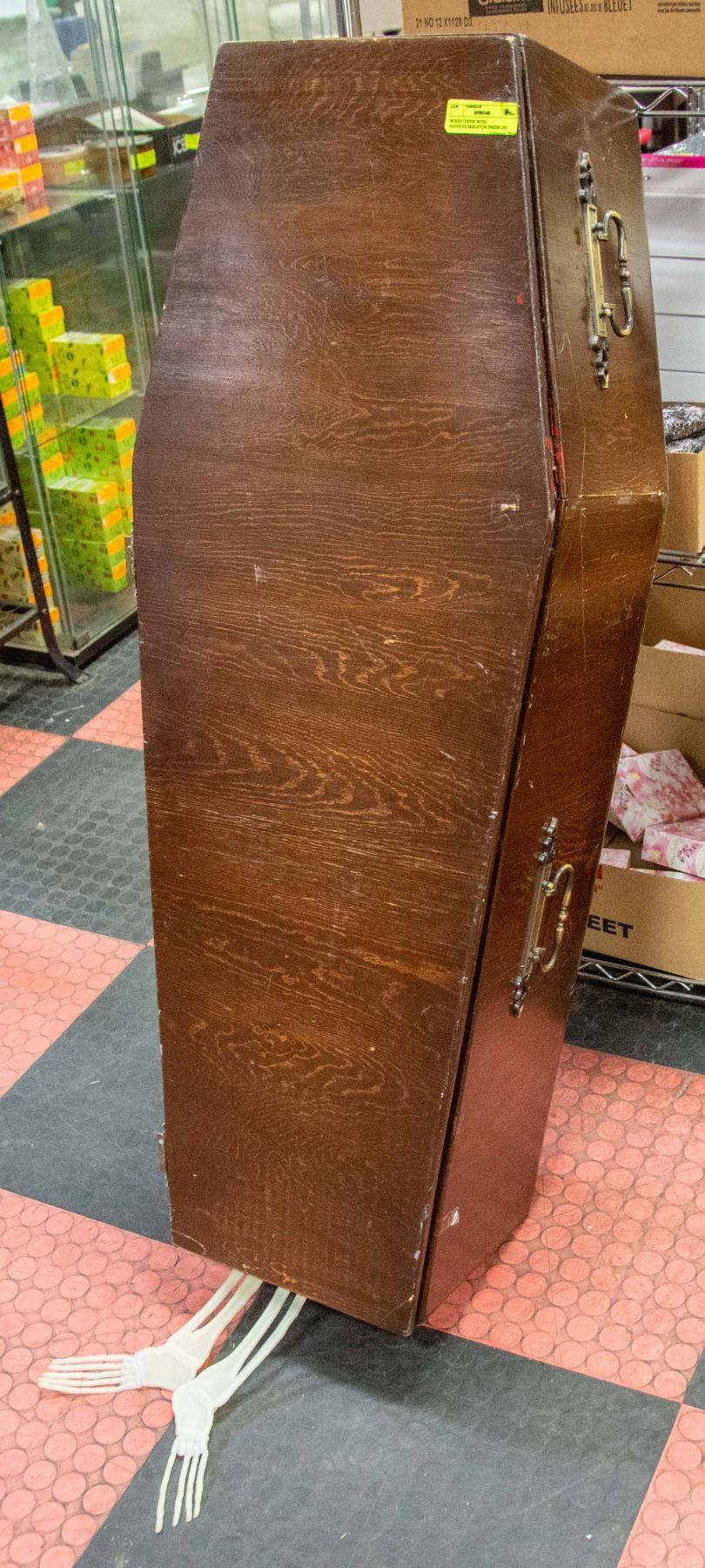 WOOD COFFIN WITH HANDLES,SKELETON INSIDE ON BLACK