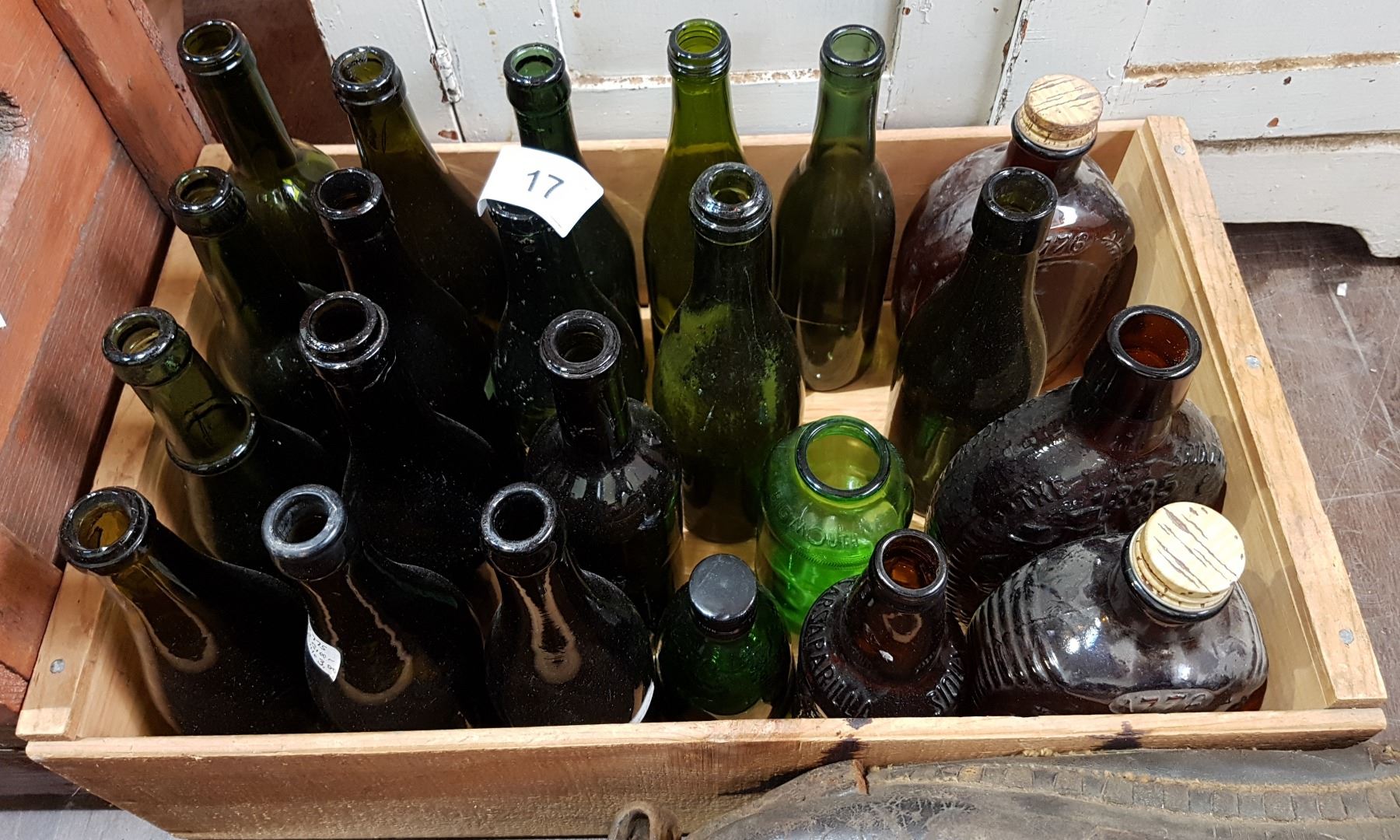 WOOD CRATE W/VINTAGE GREEN GLASS BOTTLES