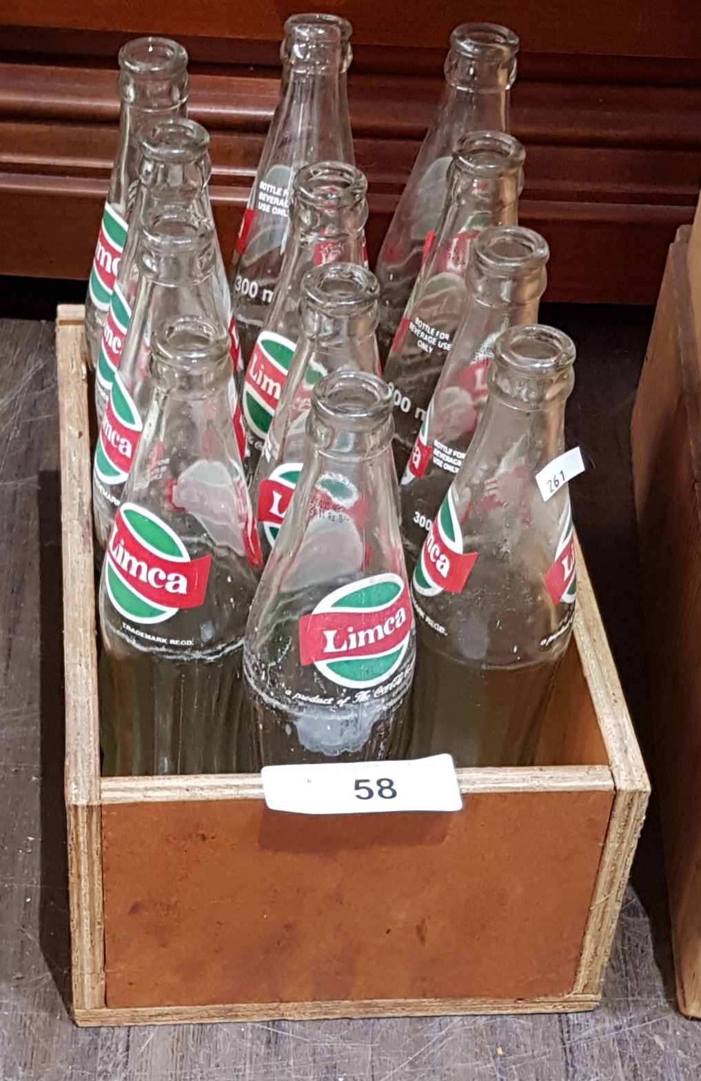 WOOD CRATE WITH 12 VINTAGE LIMCA POP BOTTLES