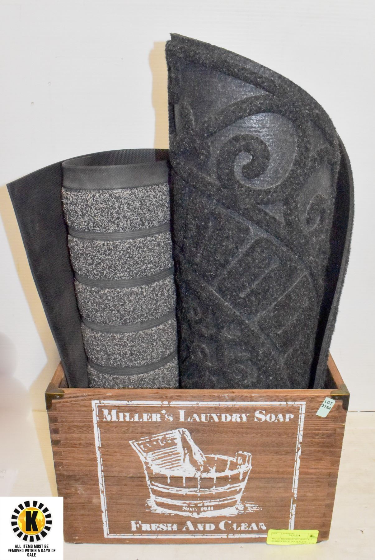 WOOD DECORATIVE CRATE & 2 RUBBER BACK DOOR MATS