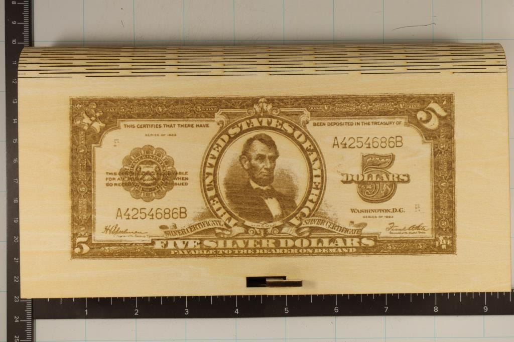 FLIP MONEY HOLDER (OR KNICKNACK, JEWELRY OR TRIKIT) BOX WITH ABRAHAM LINCOLN PORTHOLE $5 SILVER CERTIFICATE ENGRAVED ON LID (NO BILL INCLUDED). 9" X 4 3/4" X 1 1/4" FITS. WITH LATCHING LID MADE FROM BALTIC BIRCH WOOD.