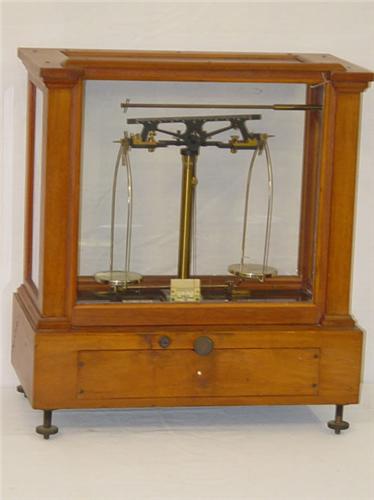 WOOD & GLASS CASED BALANCE SCALE-MADE BY HENRY TRUEMNER FOR ARTHUR H. THOMAS CO. PHILADELPHIA - SEVERAL SETS OF WEIGHTS, MISSING KNOB ON DRAWER, IMPERFECTIONS TO CASE