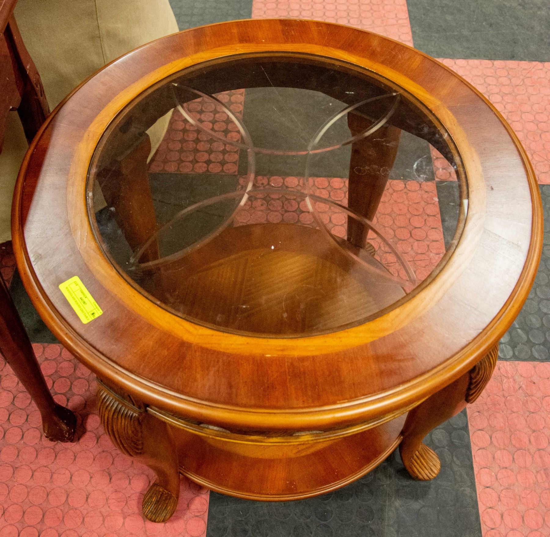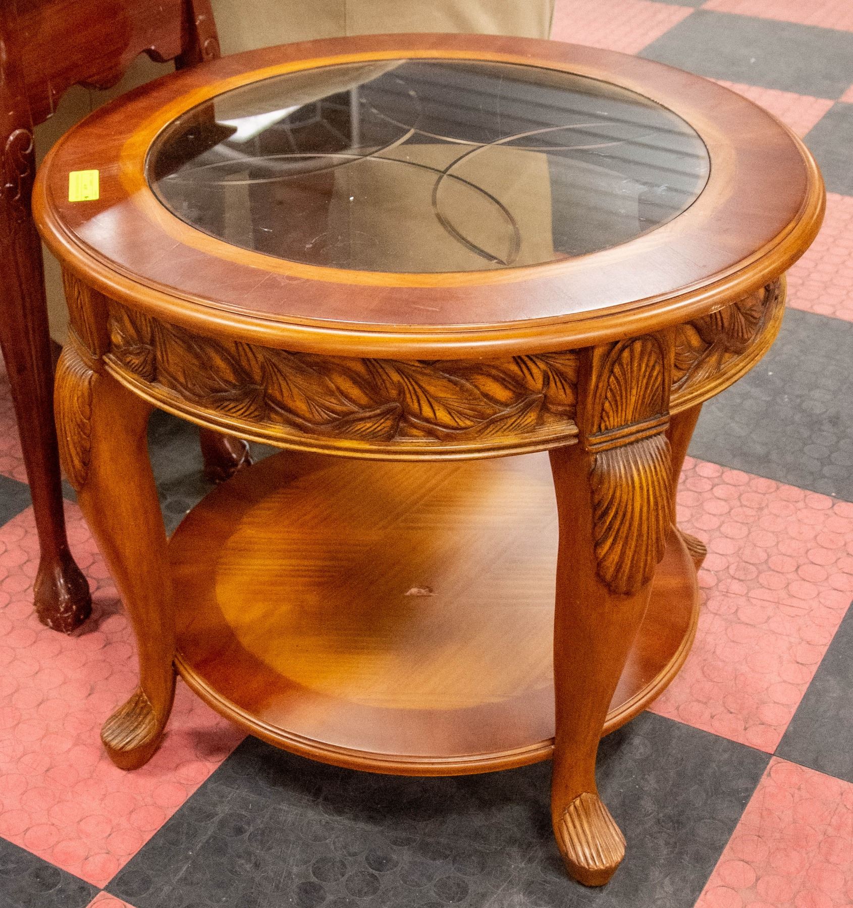 SOLID WOOD, GLASS TOP WITH CARVED ACCENTS