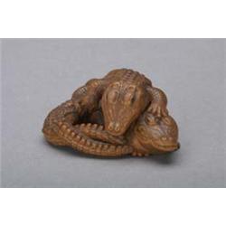 Superbly carved and stained, contemporary wood netsuke of two alligators fighting, superb detailing, inlaid black horn eyes, signed MW (Michael Webb), 1981