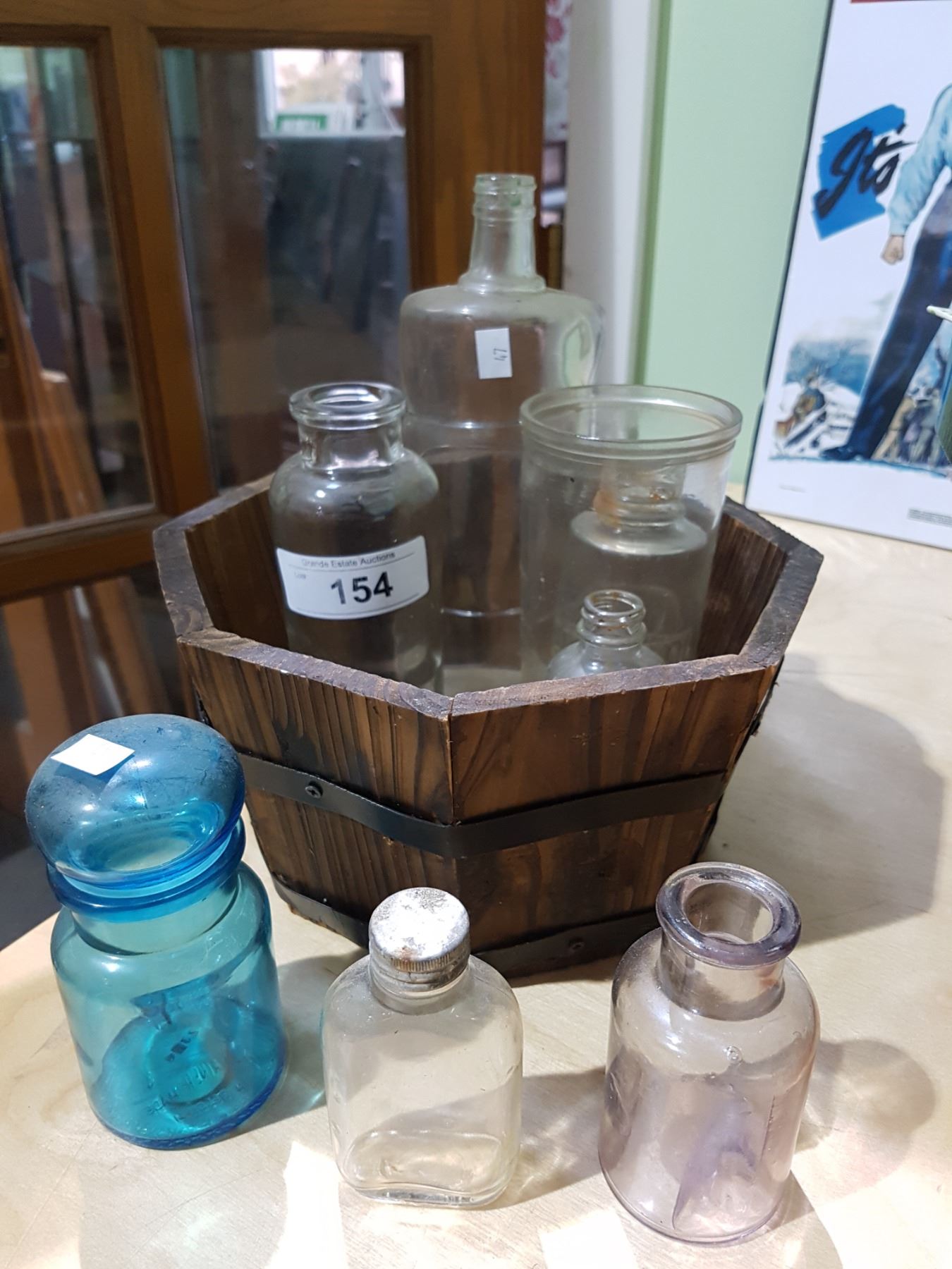 WOOD PLANTER BOX & 8 VINTAGE GLASS BOTTLES
