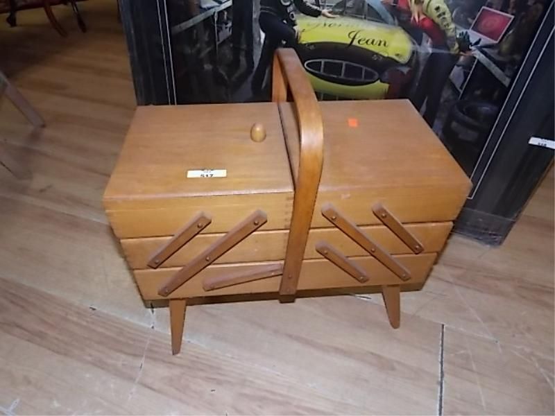 WOOD SEWING BOX ON FEET - ACCORDIAN STYLE