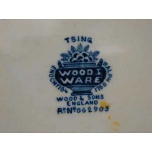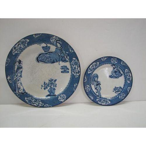 WOOD & SONS FLOW BLUE PLATE & SAUCER. Early 20th Century. Tsing pattern. Both pieces are decorated with a pair of Oriental females with a floral decorated border. Plate shows surface scratching. Both are marked on bottom. Plate: 9” Dia. Saucer: 6” Dia.