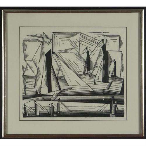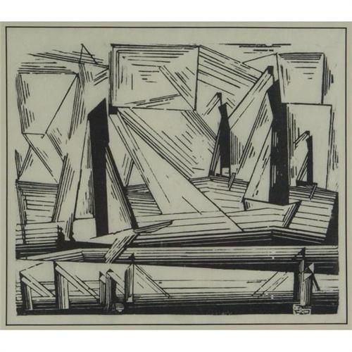 WOODCUT ON PAPER 13'' x 9.5'', Lyonel Charles Adrian Feininger (1871-1956), NY/CA. An Abstract Composition. Unsigned. State unknown. Matted and placed in a contemporary silver frame with black trim. Feininger, a renowned artist who combined both cubist and expressionistic elements in his works, was a founder and instructor at the Bauhaus and part of ''The Blue Four'', along with Kandinsky, Klee and Von Jawensky. More info. in the white binder.