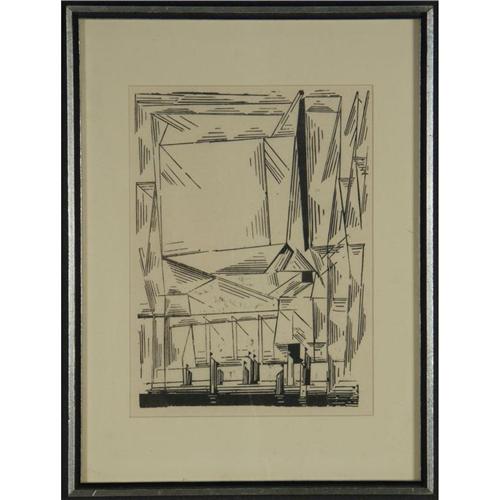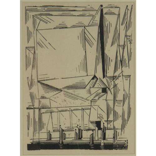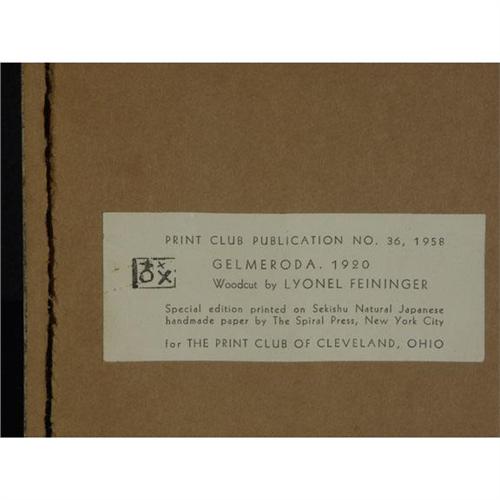 WOODCUT ON PAPER 13'' x 9.5'', Lyonel Charles Adrian Feininger (1871-1956), NY/CA. ''Gelmeroda''. 1920. From the 1958 edition of 300. Numbered ''4'' on front bottom left and right corners. Stamp of The Print Club of Cleveland and the emblem of Lyonel and Julia Feininger, lower right, on the verso. Matted and placed in a contemporary silver frame with black trim. Feininger, a renowned artist who combined both cubist and expressionistic elements in his works, was a founder and instructor at the Bauhaus and part of ''The Blue Four'', along with Kandinsky, Klee and Von Jawensky. More info. in the white binder.