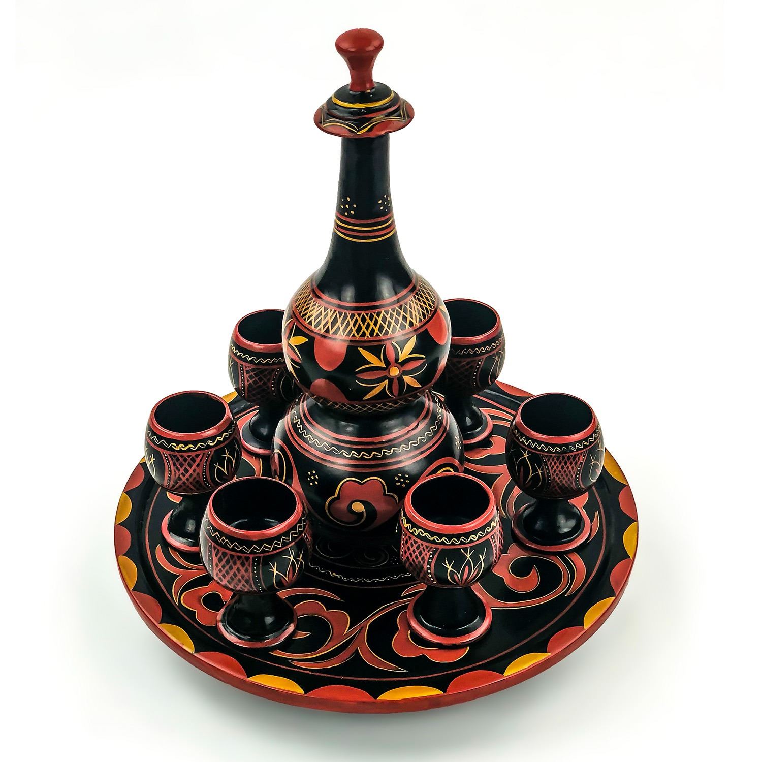 #8628 - I BELIEVE THIS SET IS RUSSIAN LACQUER WARE, NO MARKINGS, GOBLETS MEASURE 2 3/8” (6 CM) TALL, DECANTER 8.5” (21.5 CM) TALL - INCLUDING STOPPER BY 3 1/8” (8 CM) LARGEST DIAMETER, 8.75” (22 CM) DIAMETER TRAY***ITEM(S) LOCATED IN LETHBRIDGE ALBERTA. ALL ITEMS IN THIS AUCTION QUALIFY FOR OUR FREE TRANSPORT TO EDMONTON SERVICE. WORLDWIDE SHIPPING AVAILABLE