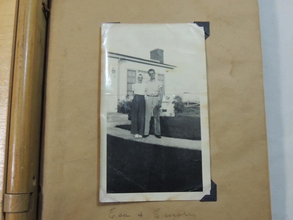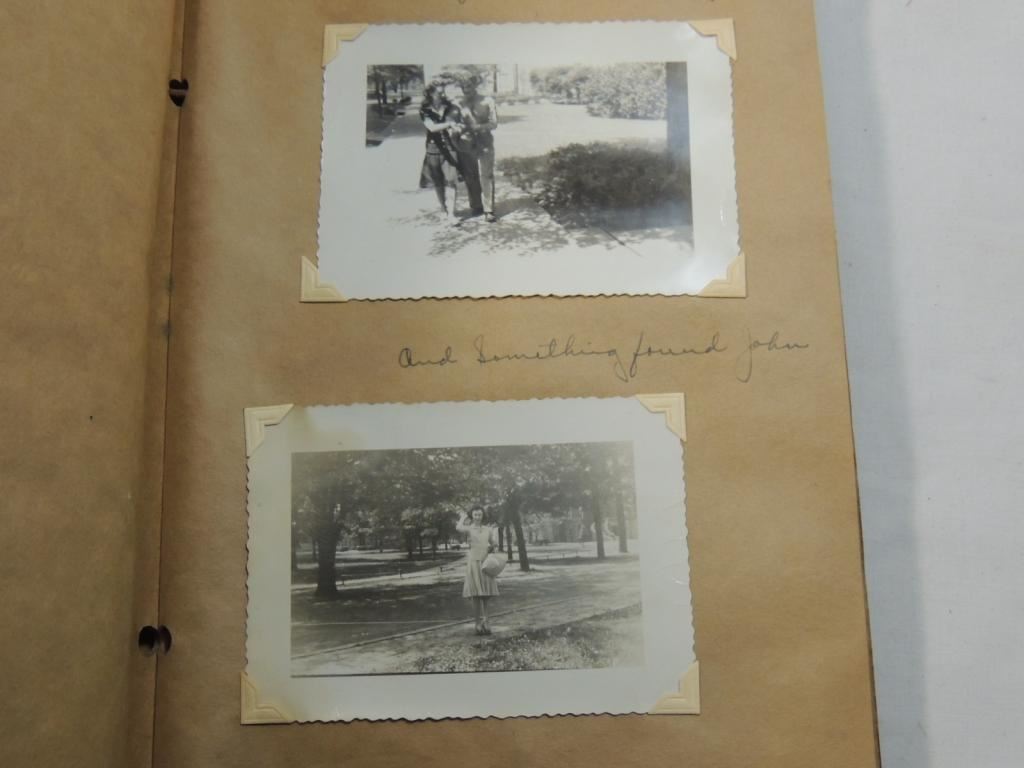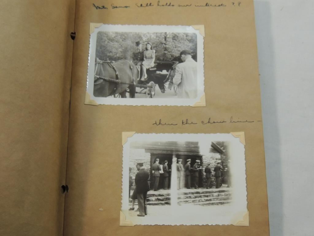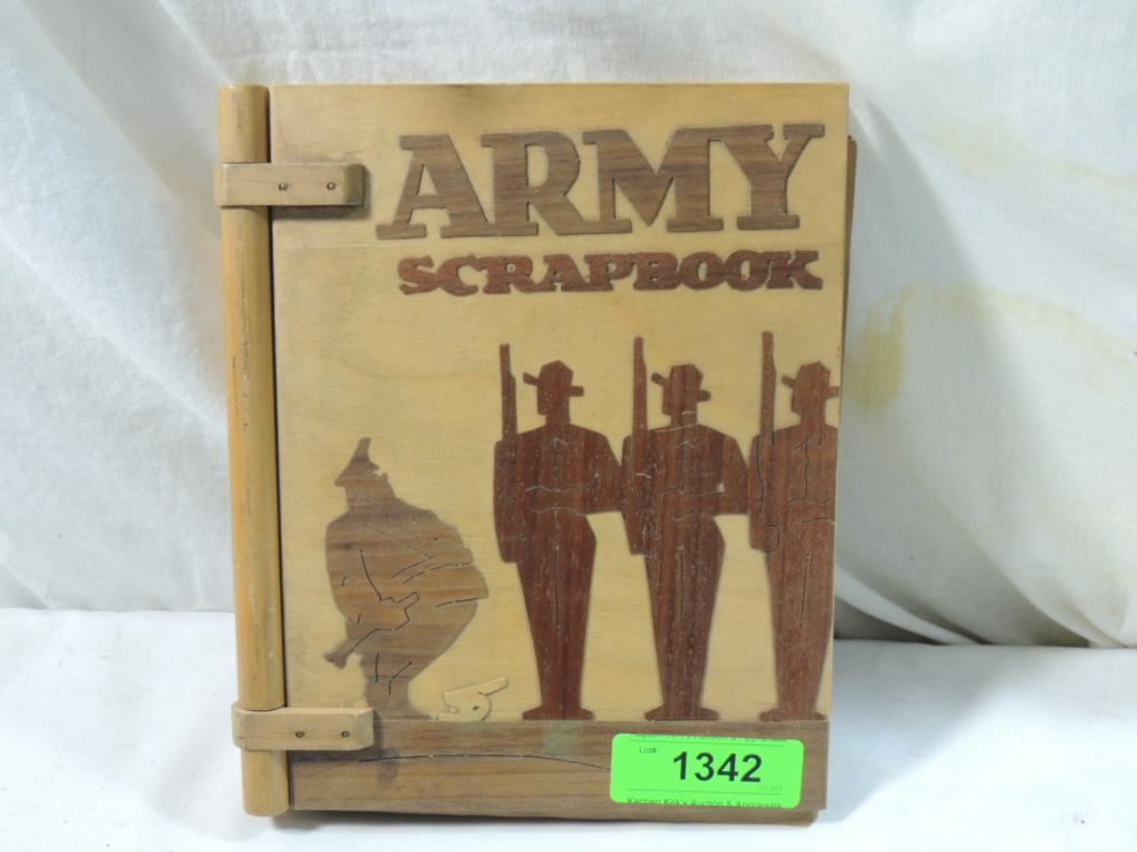 FILLED WITH MANY VINTAGE BLACK AND WHITE PHOTOS ARMY PHOTOS WW1 WW2 WORLD WAR 1 WORLD WAR 2 WOODEN SCRAPBOOK ALBUM AS SHOWN SEE PHOTO FOR MORE DETAILS.