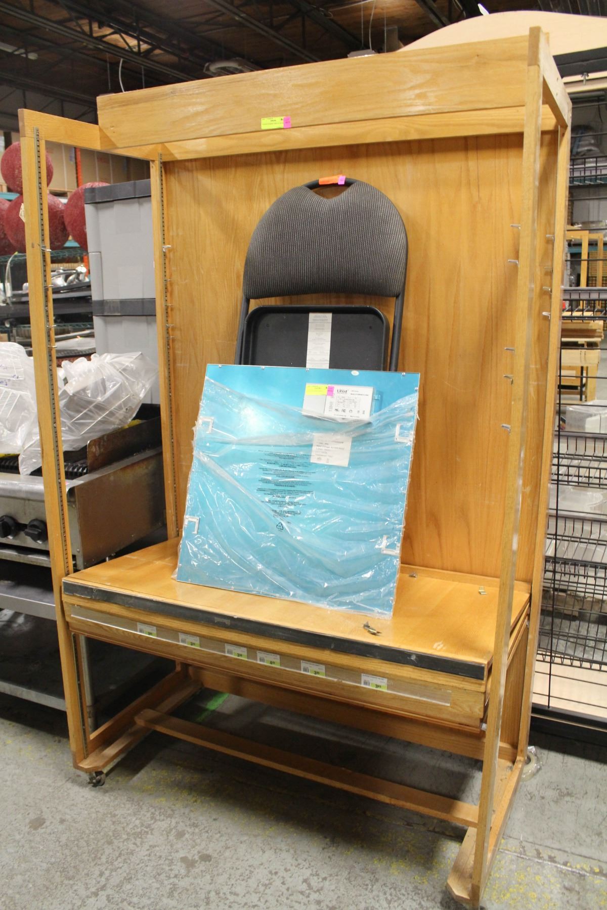 WOODEN BAKERY DISPLAY RACK. MISSING ONE WHEEL. 48X24X60