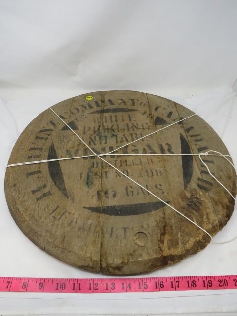WOODEN BARREL LID (H.J. HEINZ COMPANY CANADA) *WHITE PICKLING AND HOUSEHOLD VINIGAR* (APPROX 20 INCHES WIDE)